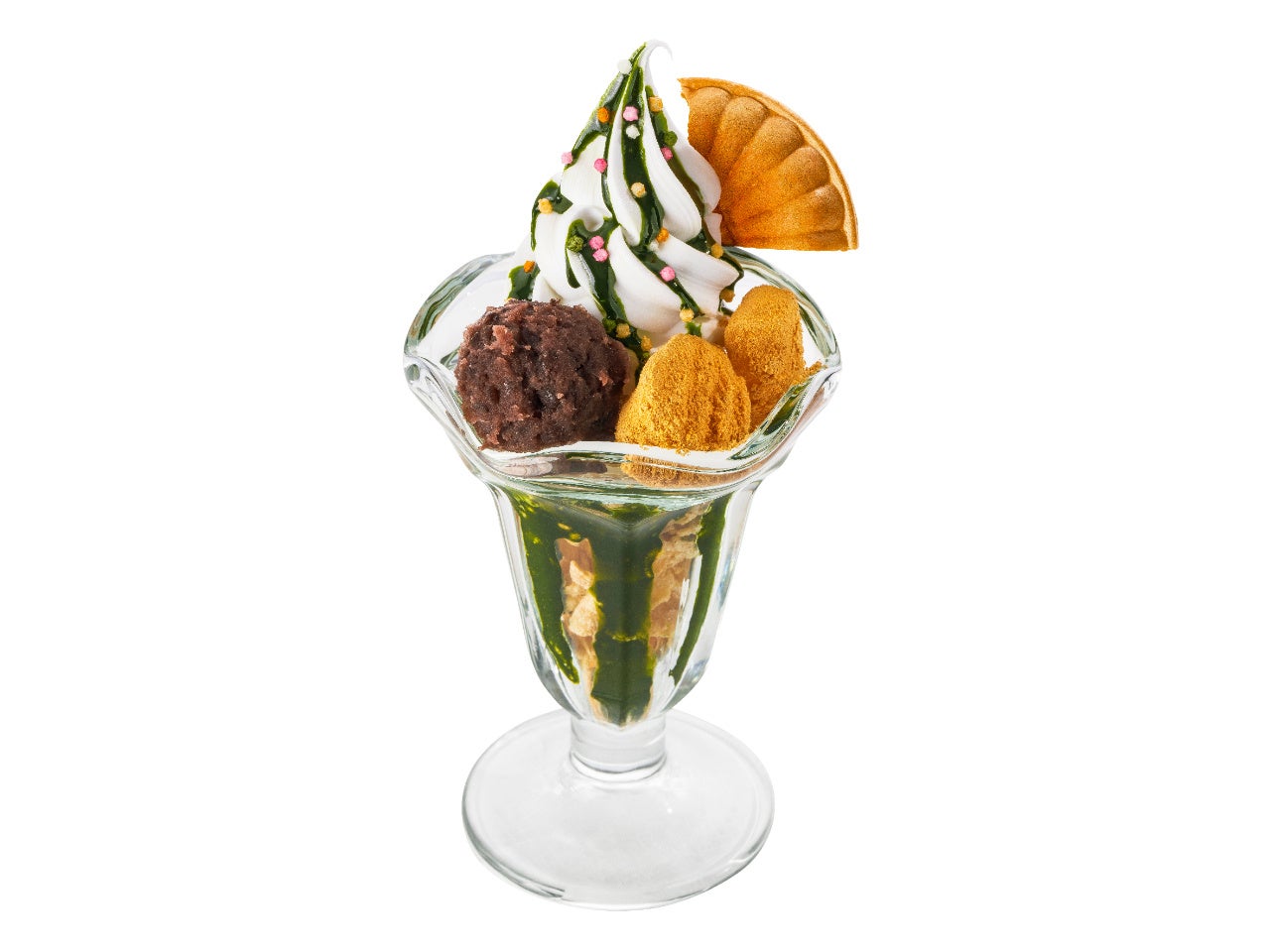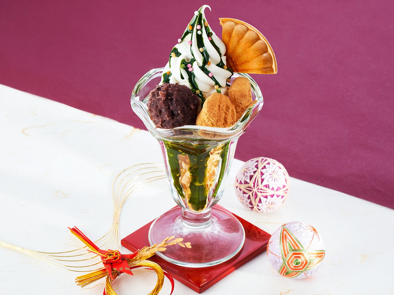 「京わらび餅&京仕立て小豆のお抹茶みやびパフェ」は、京きな粉のわらび餅や抹茶ソースがサンマルクカフェオリジナルのソフトクリームと相性抜群なスペシャルパフェメニュー。濃厚な抹茶ソースの香り高く上品な苦味と京白味噌を加えた十勝産のつぶあんや花びらもなかの甘み、ソフトクリームのコクを同時にお楽しみいただけ、お正月に彩りを加えます。