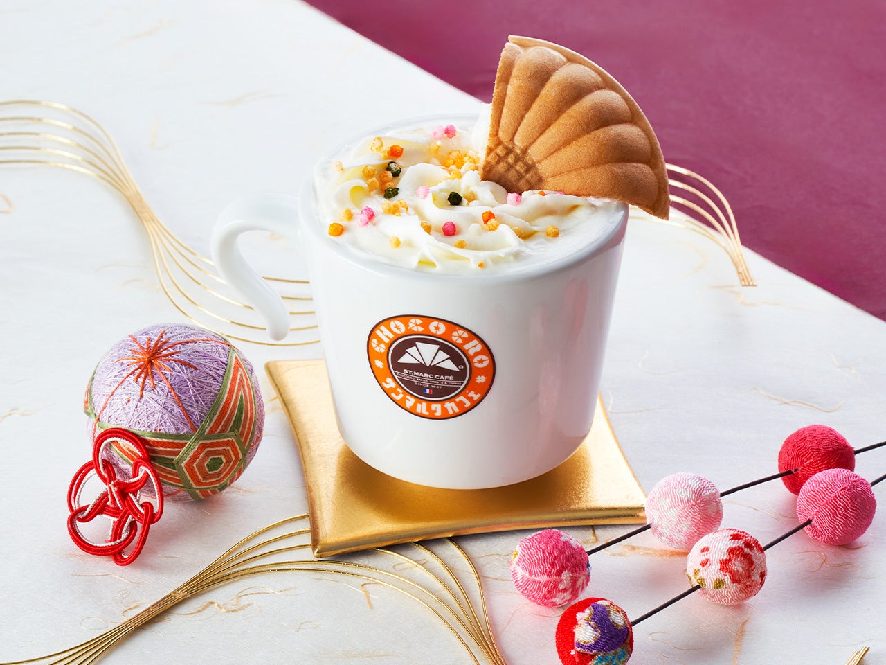 「京おしるこおもちラテ~ぶぶあられと花びらもなか~」は、京白味噌を加えた十勝産のつぶあんの優しい甘さとミルクのコクが混ざり合った、口当たりまろやかで奥深い味わいのおしるこです。ぶぶあられと花びらの形をしたもなかをトッピングし、京都らしさとお正月らしさの両方を表現しました。時間とともにとろけ出すお餅をスプーンですくってお楽しみください。