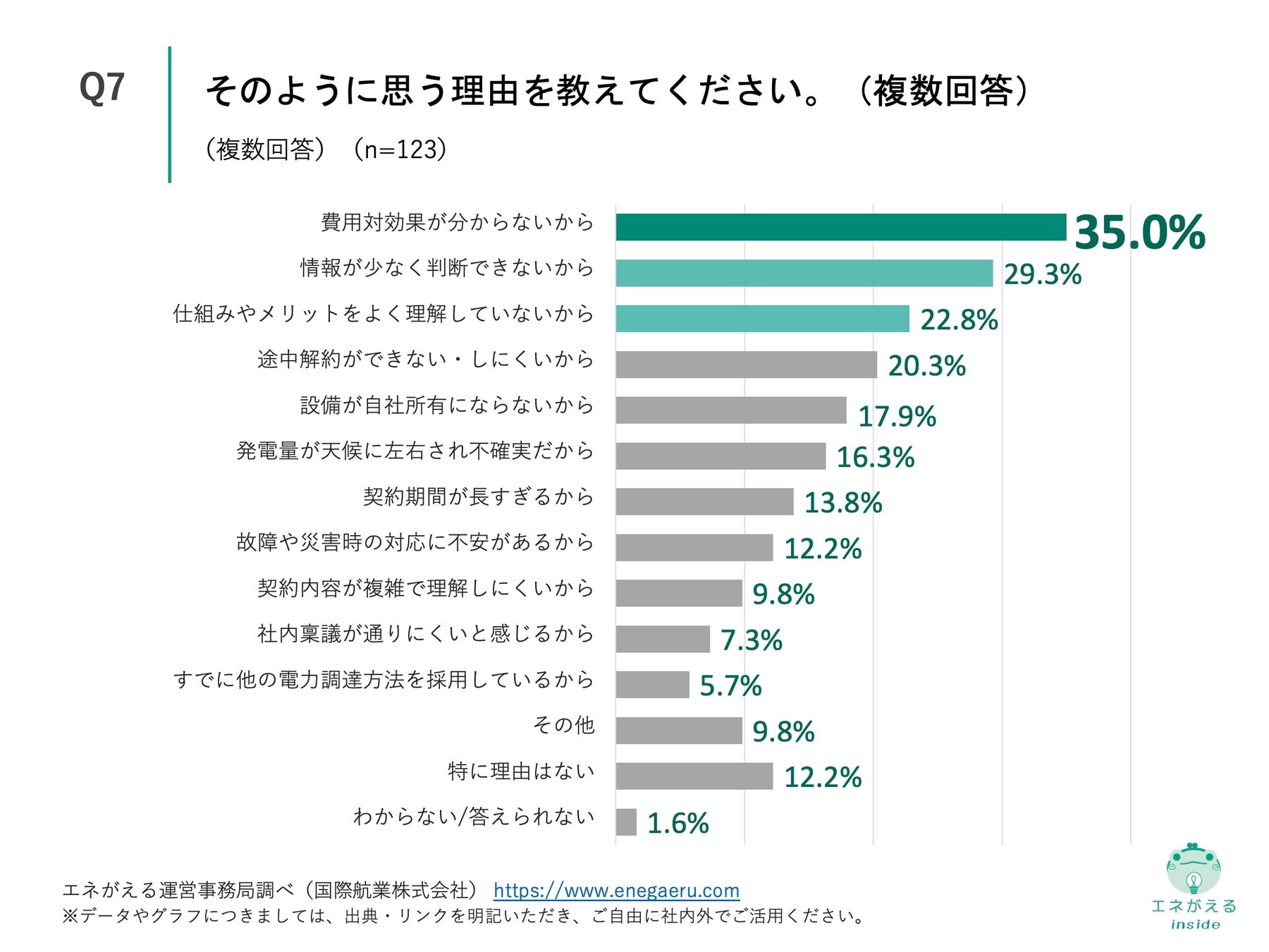 「Q7. Q5で「あまり検討したくない」「全く検討しない」と回答した方にお聞きします。そのように思う理由を教えてください。(複数回答)」(n=123)と質問したところ、「費用対効果が分からないから」が35.0%、「情報が少なく判断できないから」が29.3%、「仕組みやメリットをよく理解していないから」が22.8%という回答になりました。