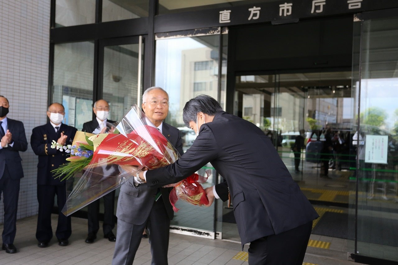 任期満了に伴う直方市長選挙で再選を果たした大塚 進弘(おおつか のぶひろ)市長が、令和5年4月26日(水)に多くの市民・職員に出迎えられ初登庁しました。