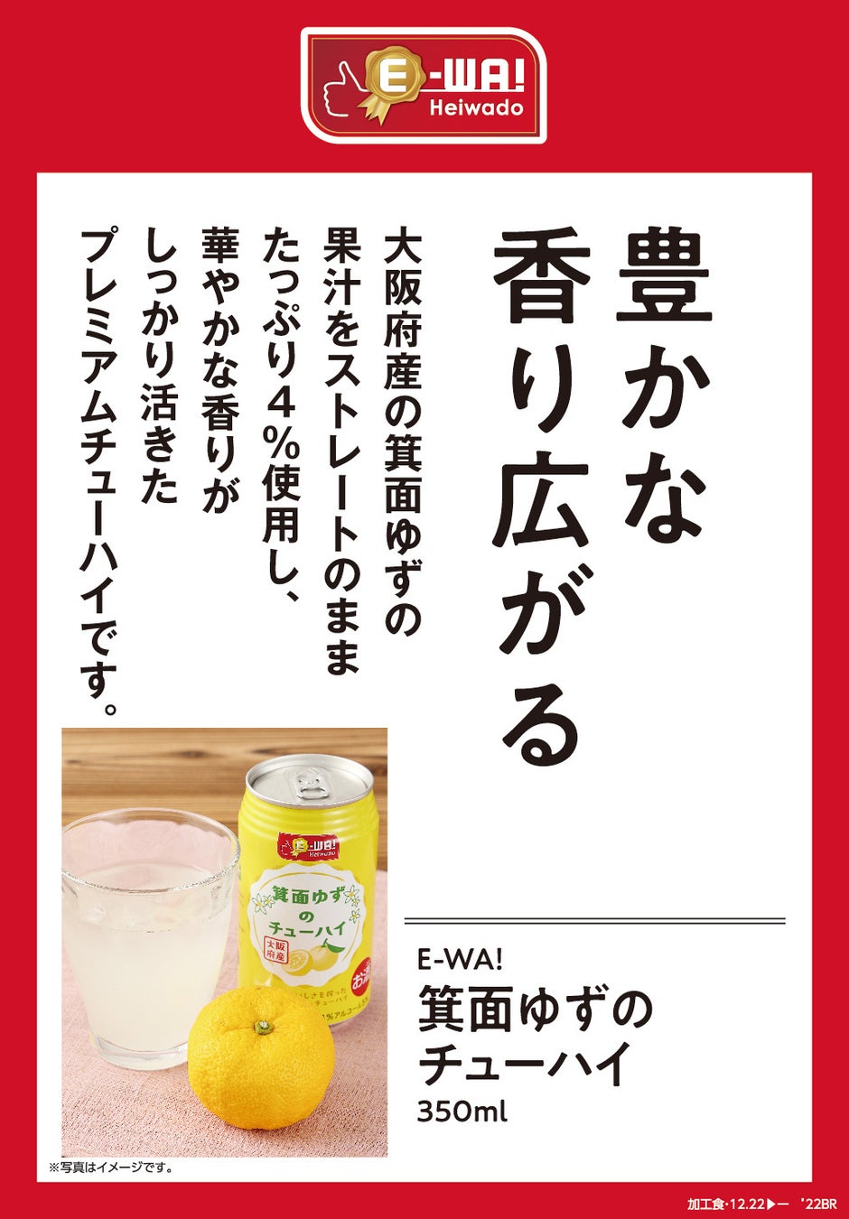 株式会社平和堂(本社:滋賀県彦根市、代表取締役社長執行役員:平松正嗣)は、平和堂ブランドE-WA!の新商品として、大阪府産の「E-WA! 箕面ゆずのチューハイ」を、12月21日(水)より平和堂・エールの157店舗で発売します。