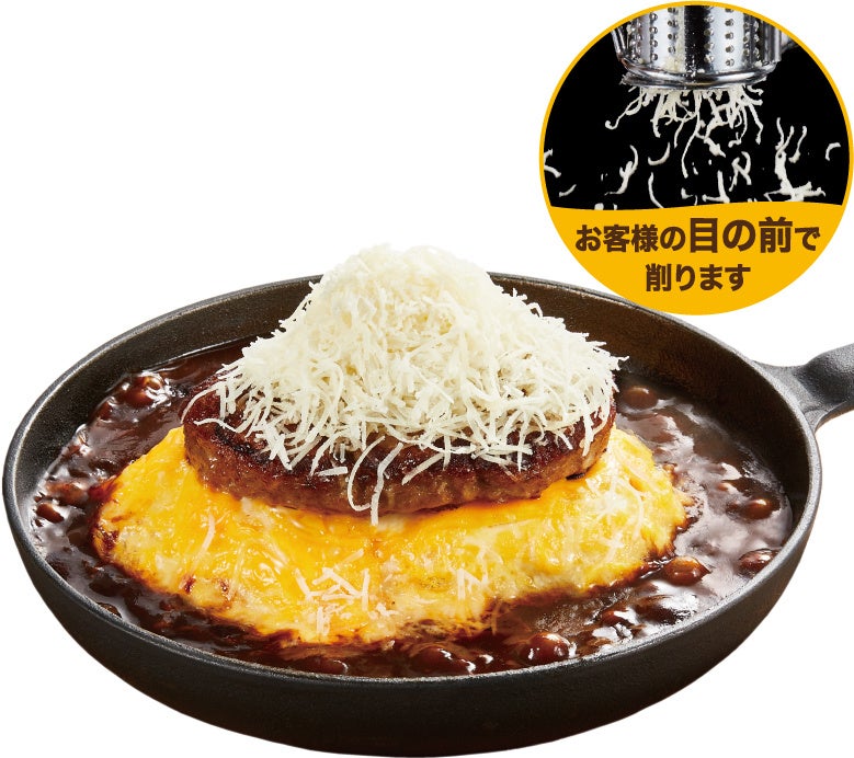 グラナパダーノチーズをお客様の目の前で削りかけることで、チーズの香りが立ち食欲がそそられます。ミルクのコクと旨みが強いグラナパダーノチーズは濃厚なデミグラスソースと相性抜群です。まるで雪山のように盛られたグラナパダーノチーズを崩しながらお召し上がりください。ハンバーグの肉汁とチーズ、デミグラスソースが混ざり合い、食べ進めるごとに濃厚になっていく味わいをお楽しみいただけます。