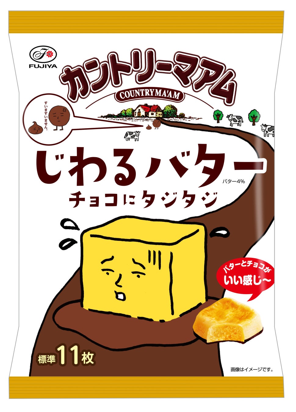 「カントリーマアムチョコまみれ」を中心に展開中の”まみれワールド”より、バターとチョコを組み合わせた新商品が登場。バターとチョコで背徳感や満足感を感じられる、季節限定商品です。個包装には「カントリーマアムじわるバター」のキャラクター「じわーるくん」がチョコにタジタジになるまでの様子が描かれています。おいしく遊び心ある“まみれワールド”をぜひお楽しみください。