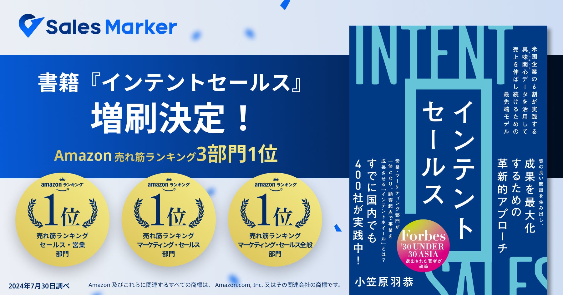 国内初※1「顧客起点」でおこなう新時代の営業手法「インテントセールス」を実現する『Sales Marker(セールスマーカー)』を開発・提供する株式会社Sales Marker(本社:東京都港区、代表取締役 CEO:小笠原 羽恭、以下:当社)は、当社代表 小笠原の初となる著書『インテントセールス - 米国企業の6割が実践する興味関心[インテント]データを活用して売上を伸ばし続けるための最先端モデル』が、ご好評により8月29日の発売前に増刷が決定したことをお知らせします。