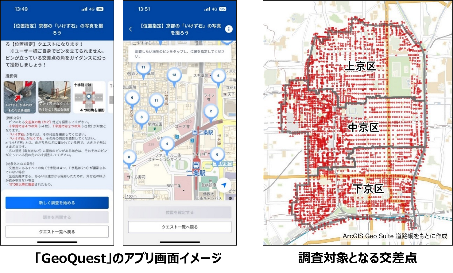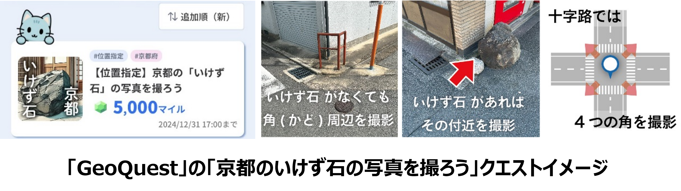 「GeoQuest」は、アプリ内でクエストとして出題された写真を撮影して投稿するとマイルがもらえる「Photo to Earn」アプリです。この仕組みを活用して「京都のいけず石」の写真を収集します。「いけず石」がどこにあるか、なぜそこにあるのかを地図化とデータ分析によって探ります。「GeoQuest」により多くの市民が参加してデータを収集するため、広範囲を観察することができ、新たな発見につながる可能性があります。一般の地図にはない「いけず石」の情報を収集し「地域らしさ」の可視化や分析を行います。