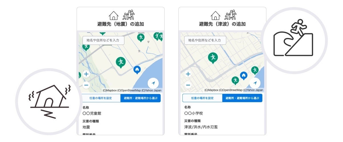 また、避難先は災害の種類によって異なるため、水害や地震、津波発生時に適した避難先も確認・登録できます。