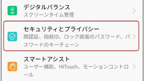 ステップ1:HUAWEIの「設定」から「セキュリティとプライバシー」を選択します。