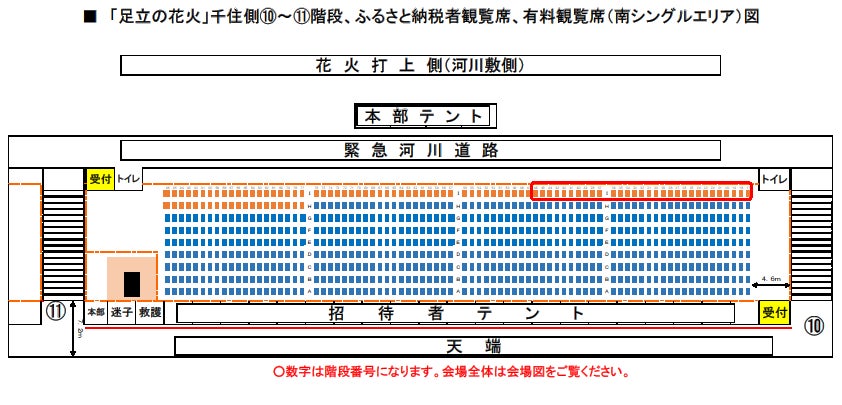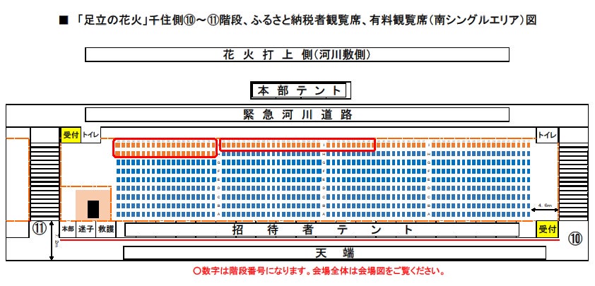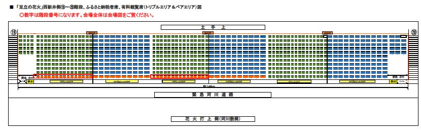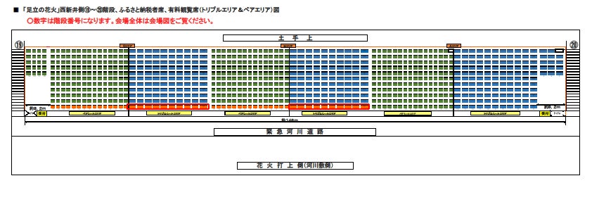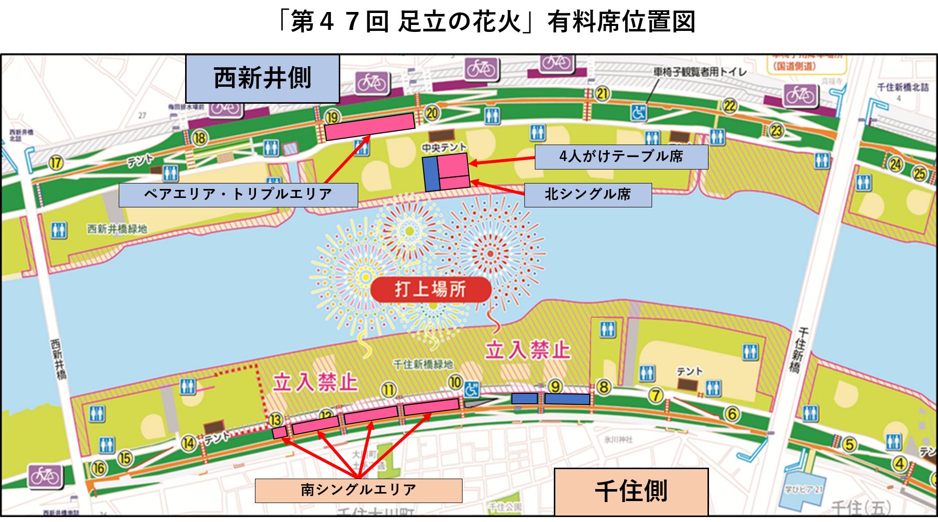 観覧席は、打ち上げポイント目の前で迫力の花火をお楽しみいただける千住側「南シングルエリア(シート敷)」と、打ち上げポイント対岸、ワイドに打ち上がる花火全体をゆったりとお楽しみいただける西新井側「北シングル席・ペアエリア(シート敷)・トリプルエリア(シート敷)・4人がけテーブル席」をご用意しました。