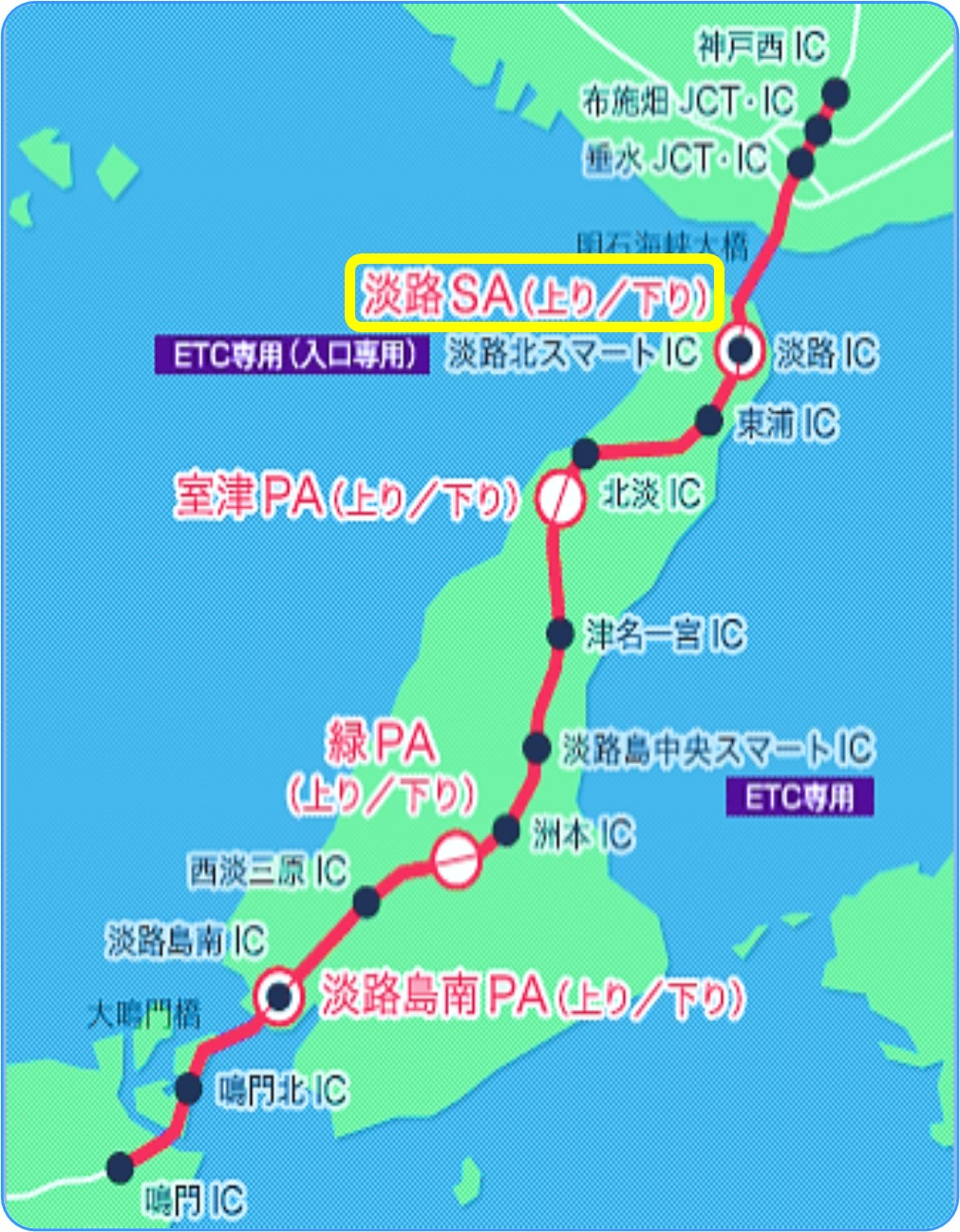 ※淡路島島内から淡路SAにお越しの場合は、淡路北スマートIC(ETC専用・入口専用)から淡路ハイウェイオアシス経由