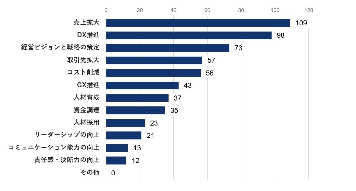 伴走支援の目的として1位「売上拡大」2位「DX推進」3位「経営ビジョン戦略の策定」と判明。