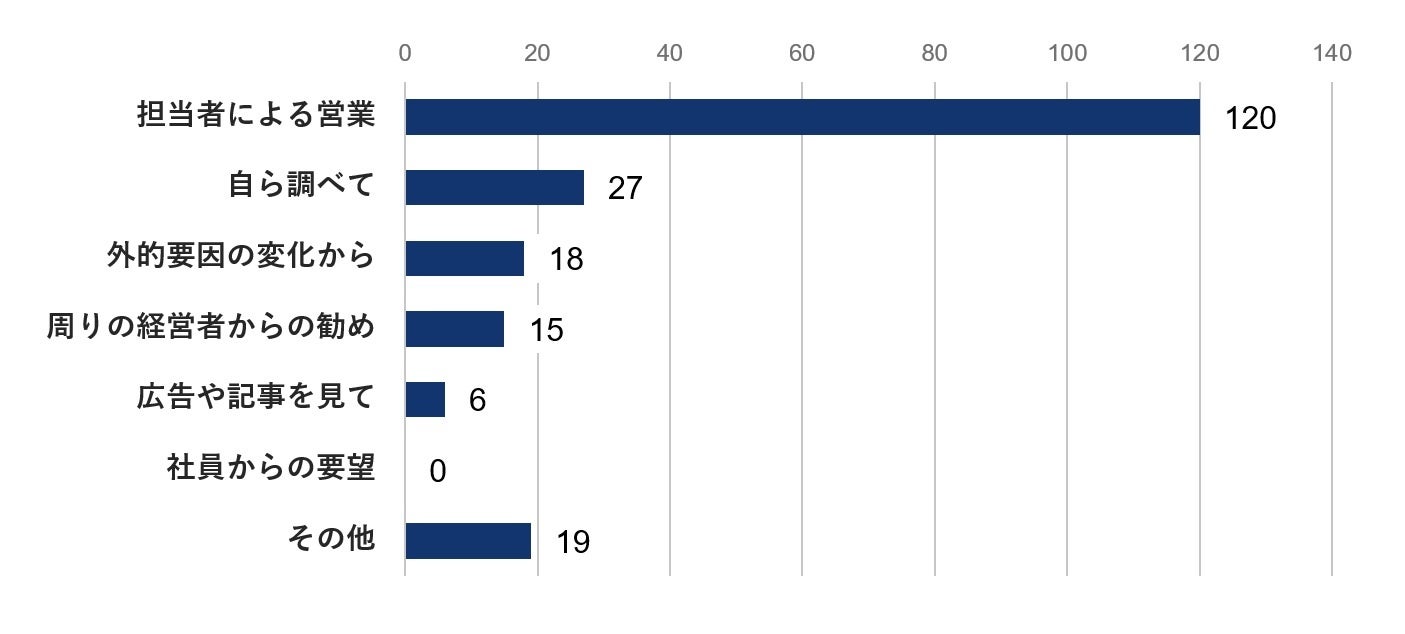 導入するきっかけは、約8割が 営業や広告などの受動的な要因からであった。