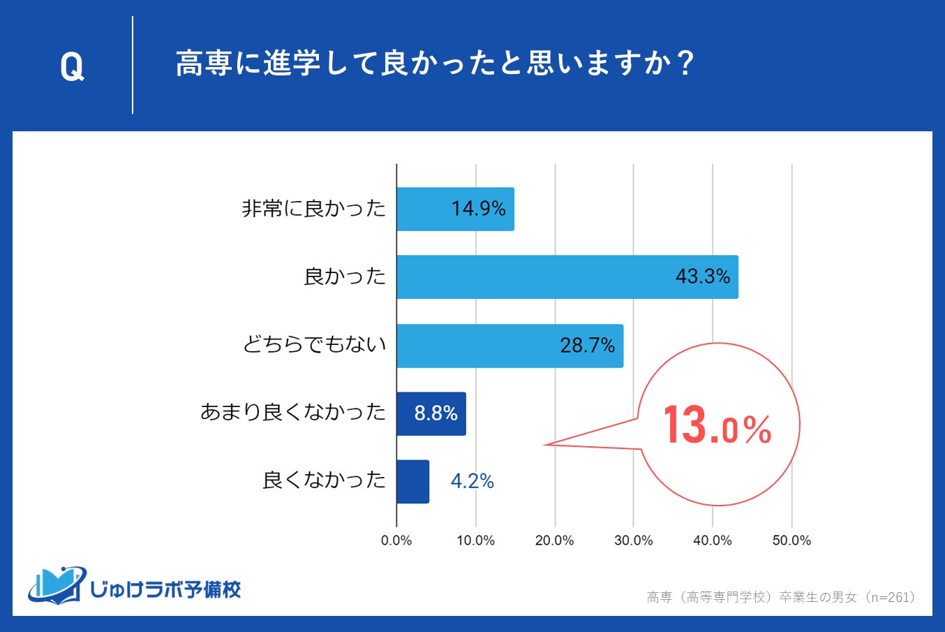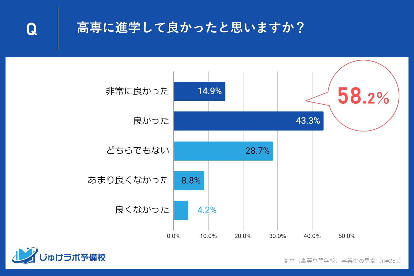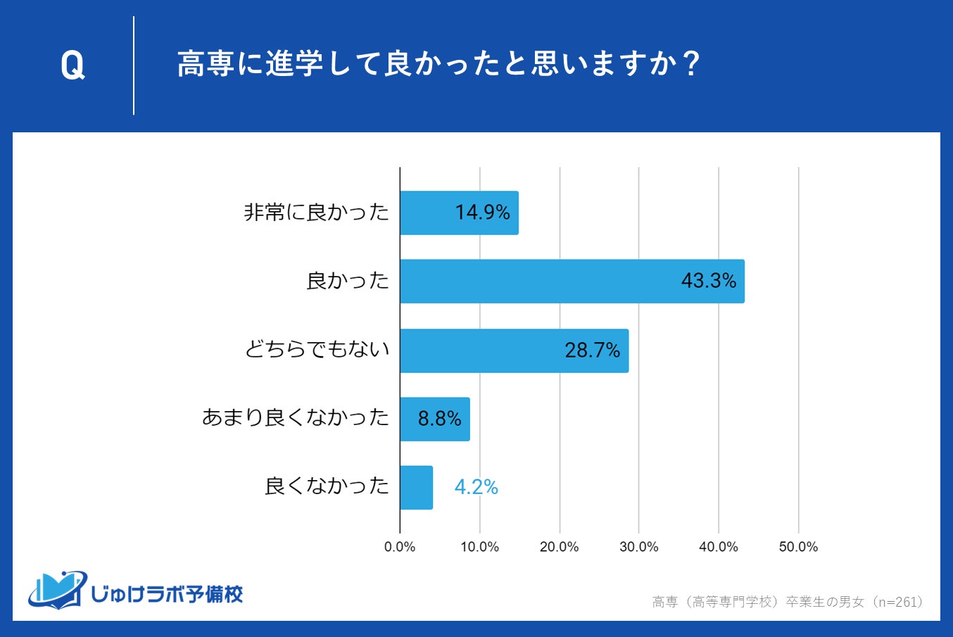じゅけラボ予備校(所在地:大阪市北区、代表取締役:後藤智則)は、高専(高等専門学校)卒業生261名の男女を対象に、高専進学を決めた理由と高専進学を選択したことに対する満足度に関する調査を実施しました。