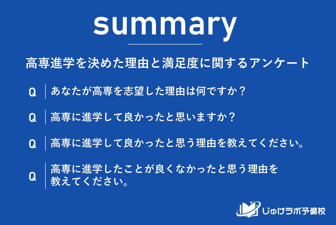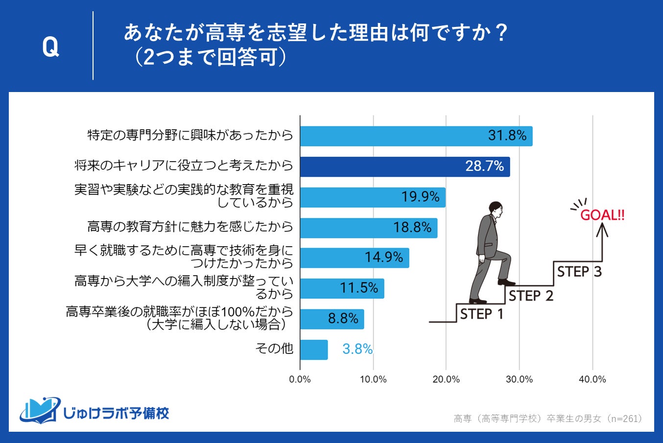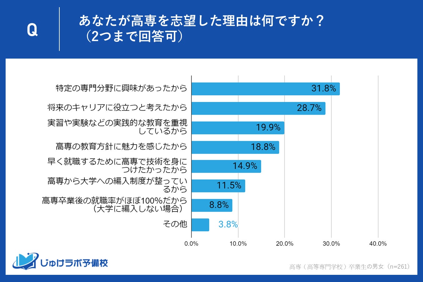 じゅけラボ予備校(所在地:大阪市北区、代表取締役:後藤智則)は、高専(高等専門学校)卒業生261名の男女を対象に、高専進学を決めた理由と高専進学を選択したことに対する満足度に関する調査を実施しました。