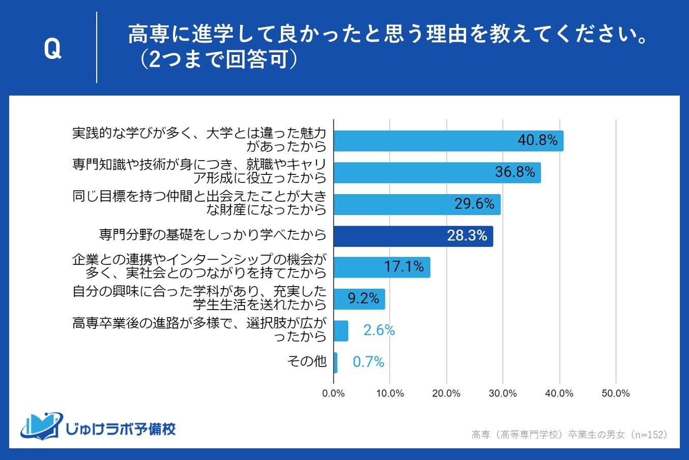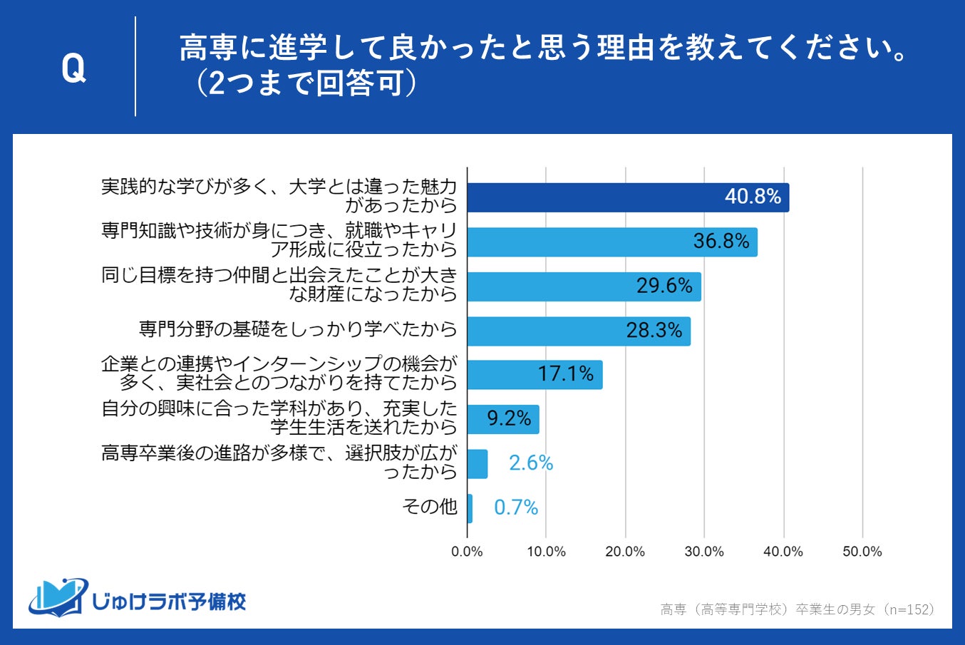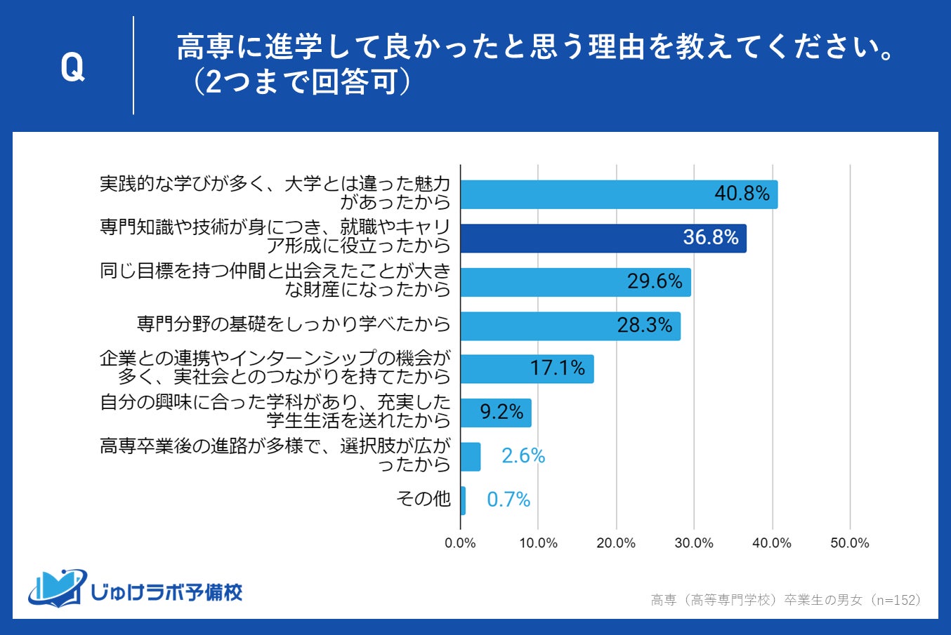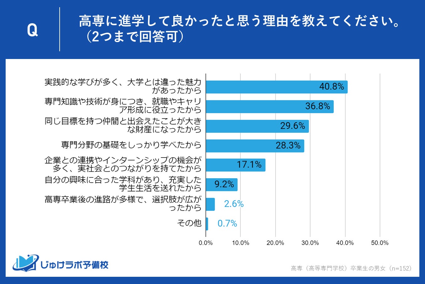 高専卒業生の中で、進学して「非常に良かった」「良かった」と回答した合計152名を対象に行った調査では、彼らが高専に進学して良かったと感じる理由についての意見が明らかになりました。最も多かったのは「実践的な学びが多く、大学とは違った魅力があったから」で40.8%を占めており、次いで「専門知識や技術が身につき、就職やキャリア形成に役立ったから」が36.8%となっています。この記事では、これらの回答の背景にある高専の教育の特長と、その魅力について深掘りします。