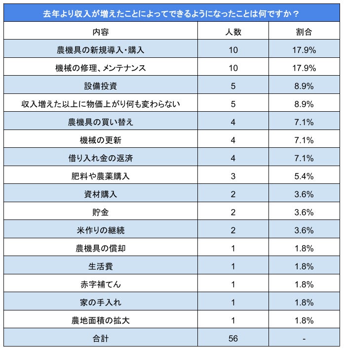 その上で、生産者様に対し「去年より収入が増えたことによってできるようになったこと」について調査しました。