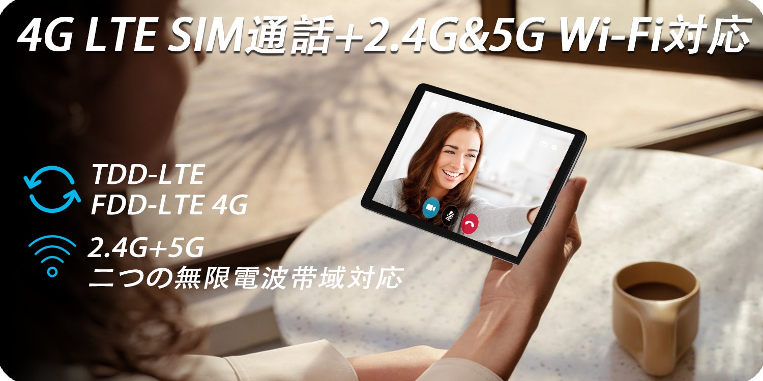 4G LTE SIM通話タブレット2.4G/5G二つの無線電波帯域対応して、そして電波交渉の少ない5G帯のWiFi接続にも対応、安定した通信と高速通信が可能です。
