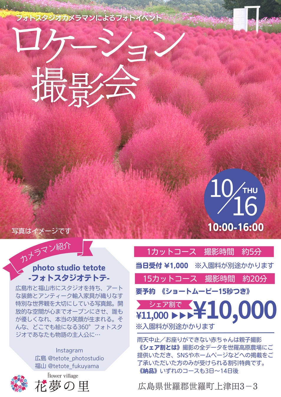 フォトスタジオカメラマンによる撮影イベントです。秋のコキア畑では初の開催です。コキア畑で印象的な一枚を残しませんか。予約なしのコースもございます。
