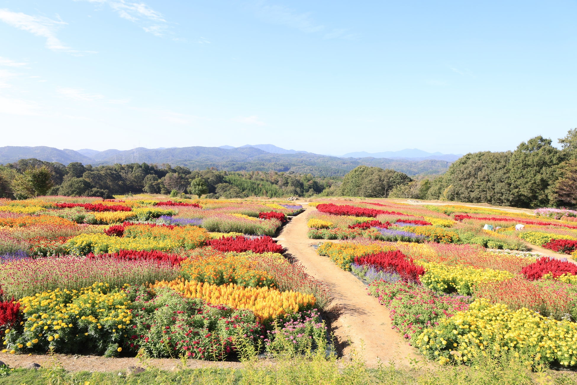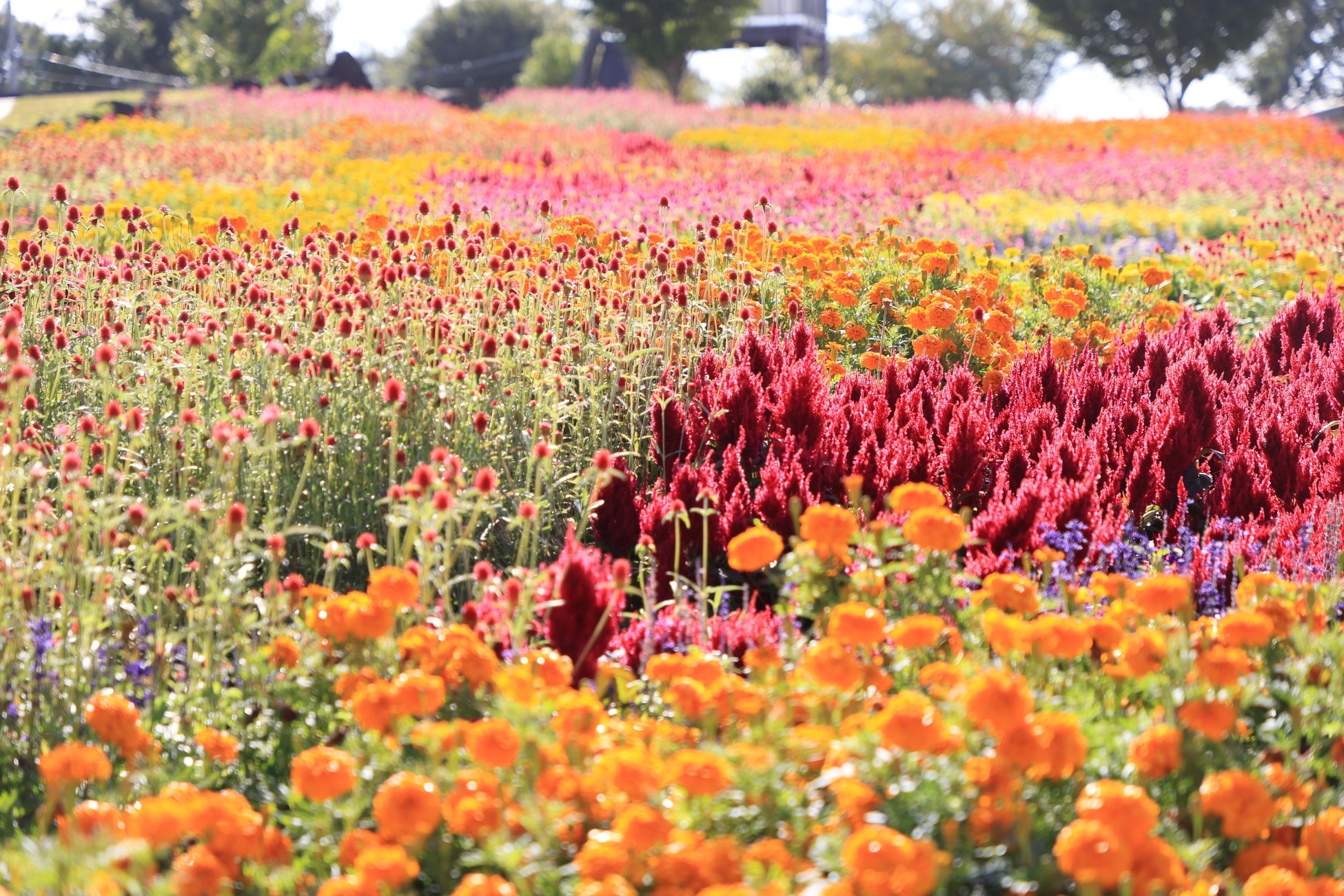 Flower village 花夢の里では「コキアとコスモスの丘」を開催中です。コキアが赤く色づき始めました。園内の花々も見ごろを迎えています。これから色づきが進むコキアと色鮮やかなパッチワークの丘をお楽しみください。10月12日(日)、19日(日)は開園時間を1時間延長し18時まで開園いたします。