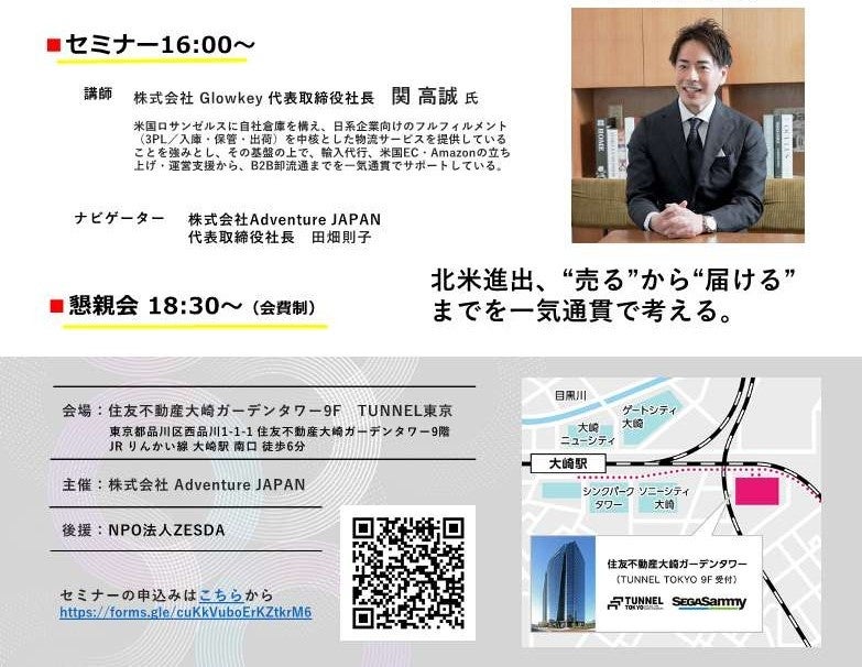 株式会社Adventure JAPAN(代表取締役社長:田畑則子、所在地:東京都品川区)は、米国進出・越境ECを検討する日本企業を対象に、「米国進出実践セミナー〜倉庫・物流・フルフィルメントの重要性〜」を2026年2月12日(木)に開催します。特定非営利活動法人ZESDA(代表理事:桜庭大輔、所在地:東京都中央区)は本セミナーを後援します。