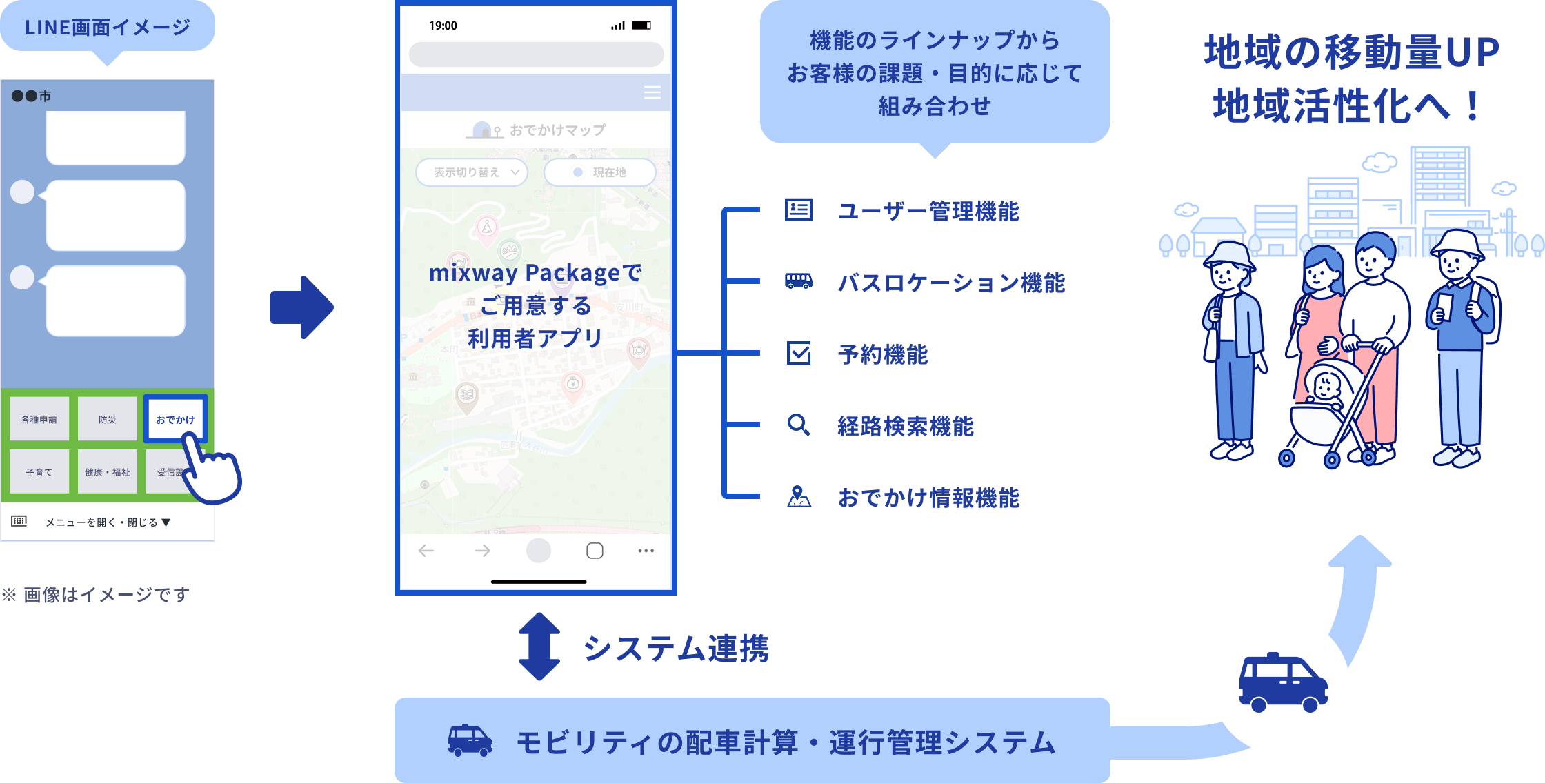 「mixway Package」は、MaaS(Mobility as a Service)の構成要素となる経路検索、予約、事前決済などの交通サービスに必要な機能を標準化した開発サービスです。「LINE」を活用した予約アプリには、オンデマンド交通の予約機能のほか、事前決済機能、停留所・車両・イベント情報掲載機能を搭載しています。アプリをイチから構築するのではなく、既存のラインナップから必要な機能を組み合わせてご提供するため、低コストでの導入を実現することができます。
