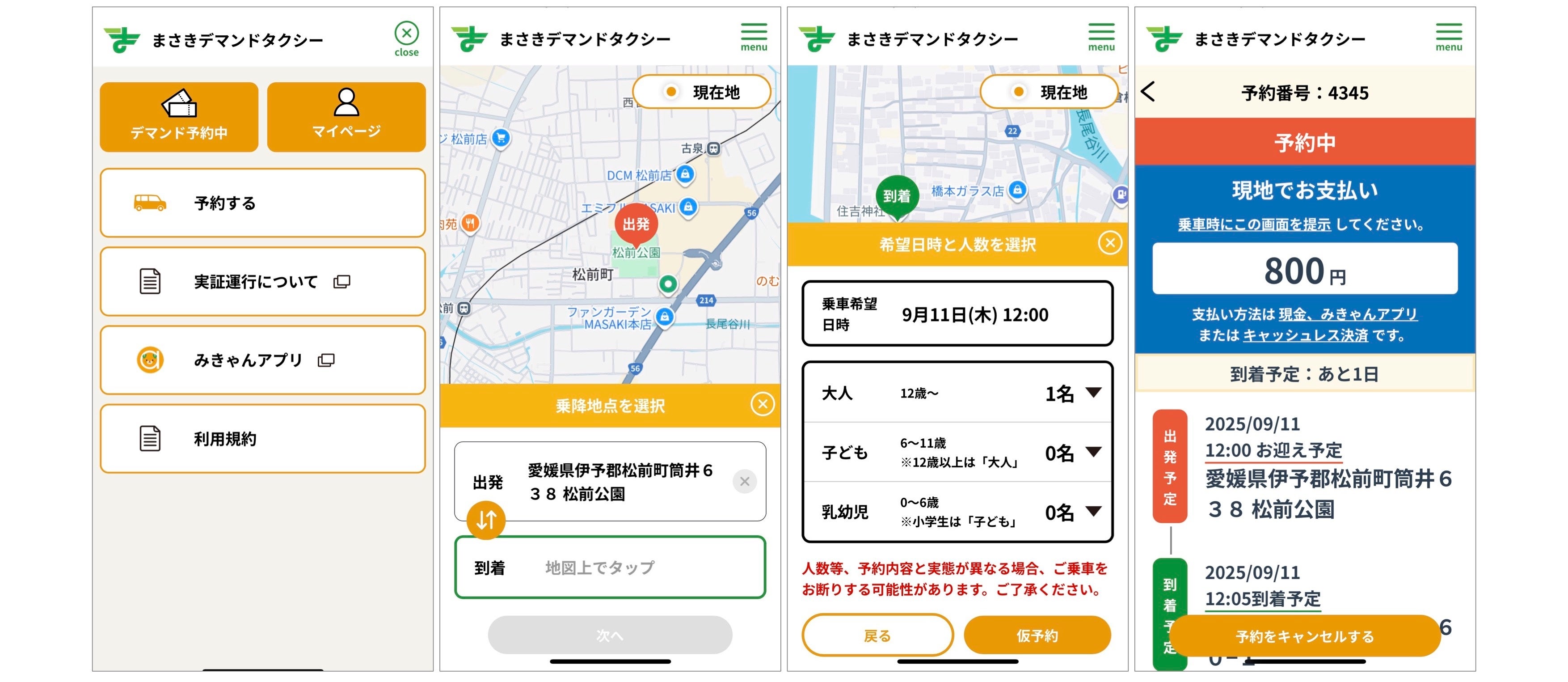 今回、「mixway Package」ではLINEをベースとした予約インターフェースを提供しました。利用者は愛媛県の県民アプリ「みきゃんアプリ」から「まさきデマンドタクシー」の予約システムへアクセスし、地図上で乗降地点を選択し、乗車希望日時や、人数入力などの予約機能を利用することができます。また、予約依頼の受付、予約完了、キャンセル完了の通知もLINE上で受信・確認が可能です。