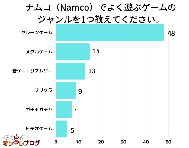 「ナムコ(Namco)でよく遊ぶゲームのジャンルを1つ教えてください。」アンケート調査した結果、1位は『クレーンゲーム』でした。