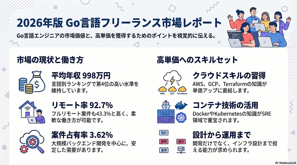 高単価を獲得するには、Go言語によるバックエンド開発に加えTerraformやDocker、AWS/GCPなどのクラウド関連スキルを備え、設計から運用まで一貫して担えるスキルセットを構築することが大切です。