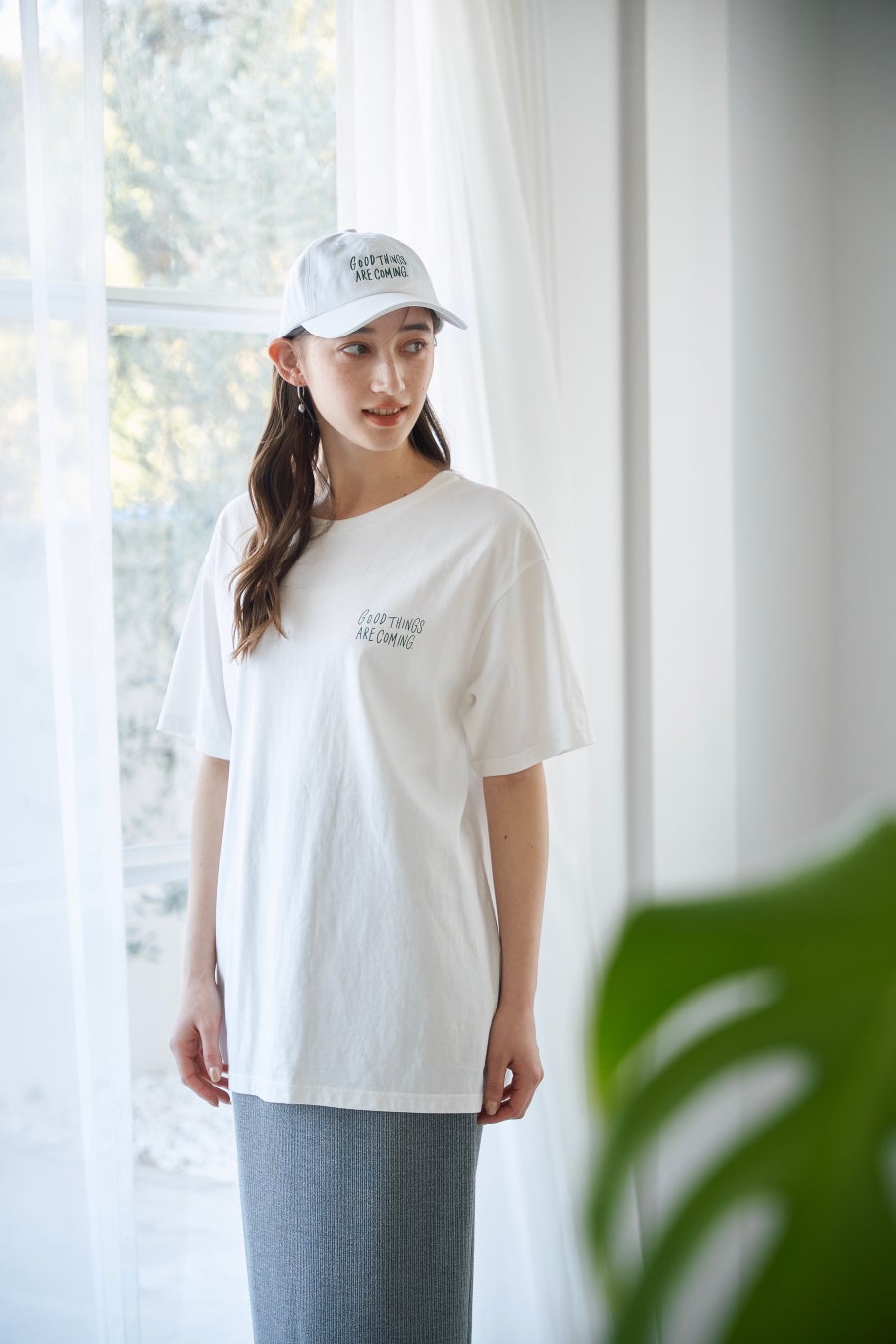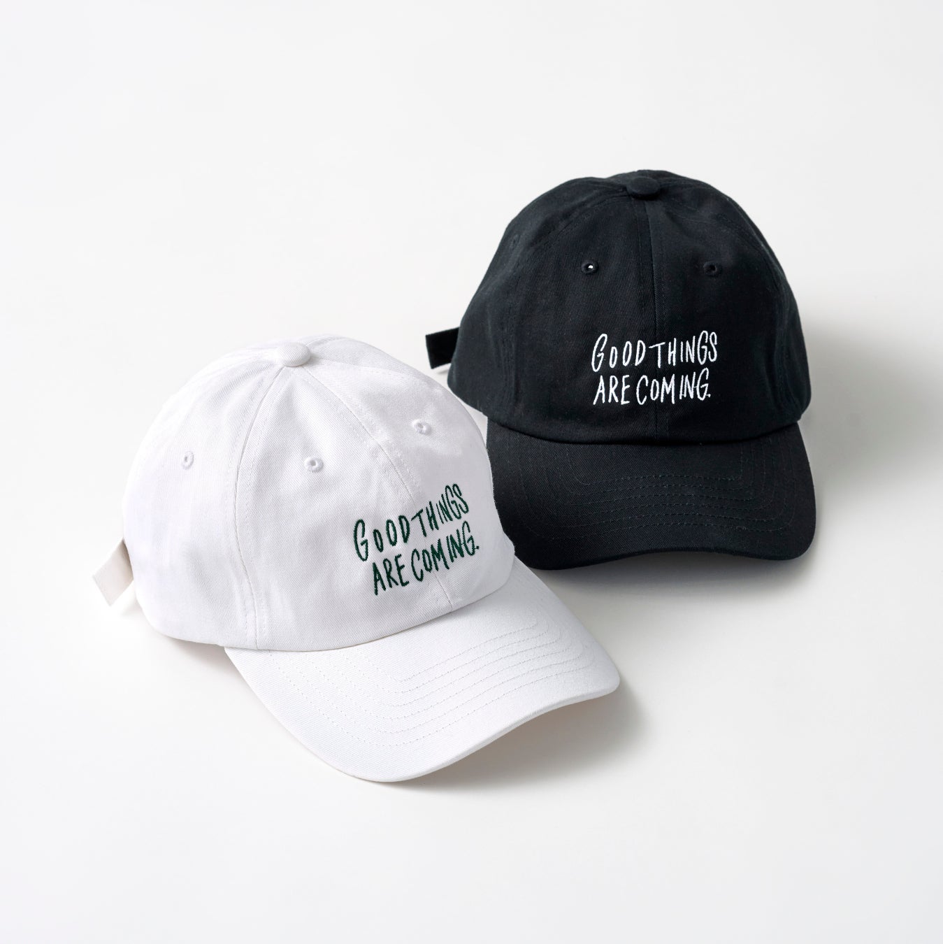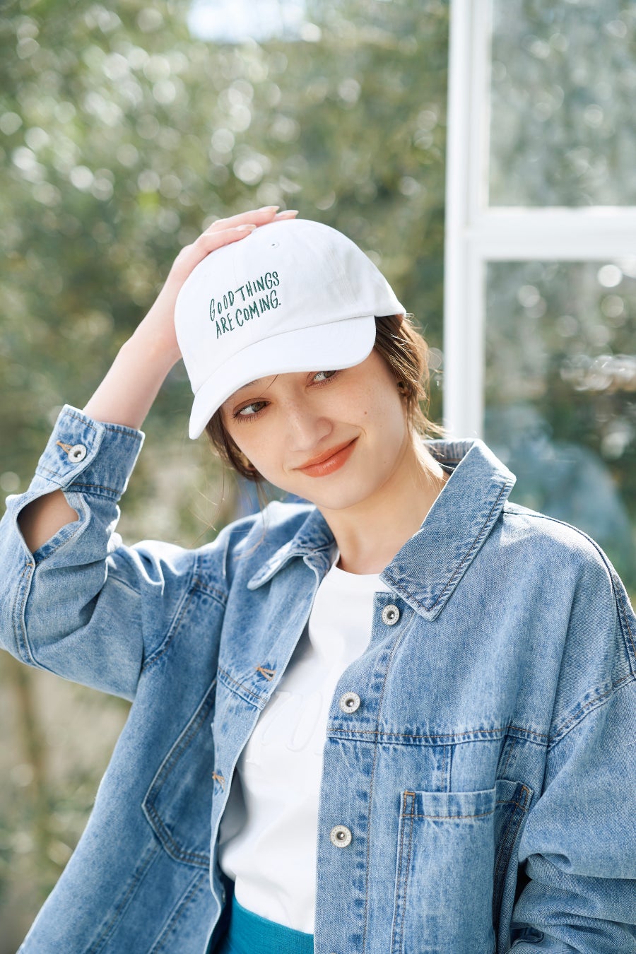 Tシャツと同じメッセージをあしらったキャップも展開。オフにはグリーン、ブラックにはオフで刺繍を施しました。細字のテキストメッセージを活かしたシンプルなデザインは、都会的で洗練されたイメージ。カジュアルスタイルだけでなく、エレガントな着こなしの外しとして取り入れるのもおすすめです。