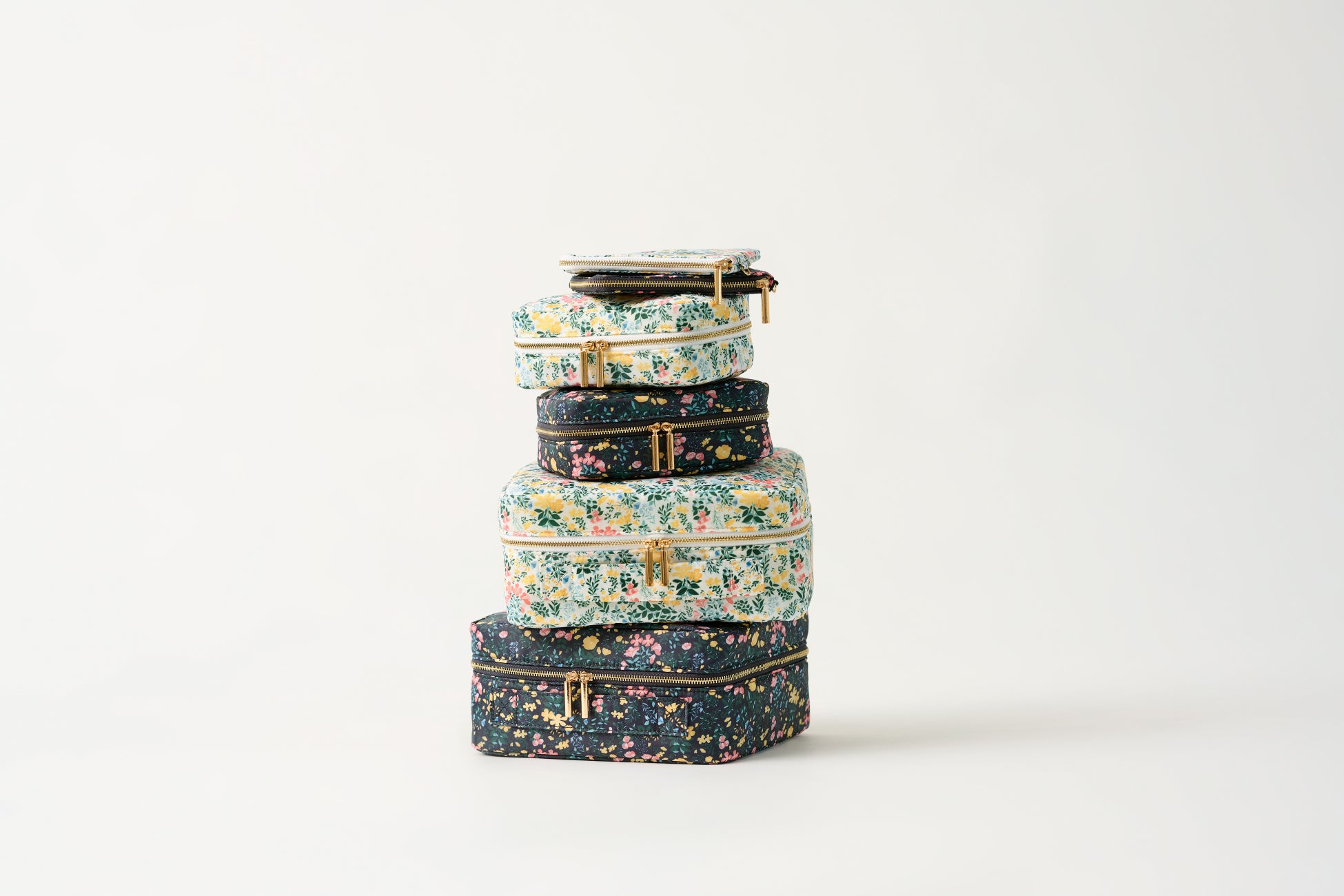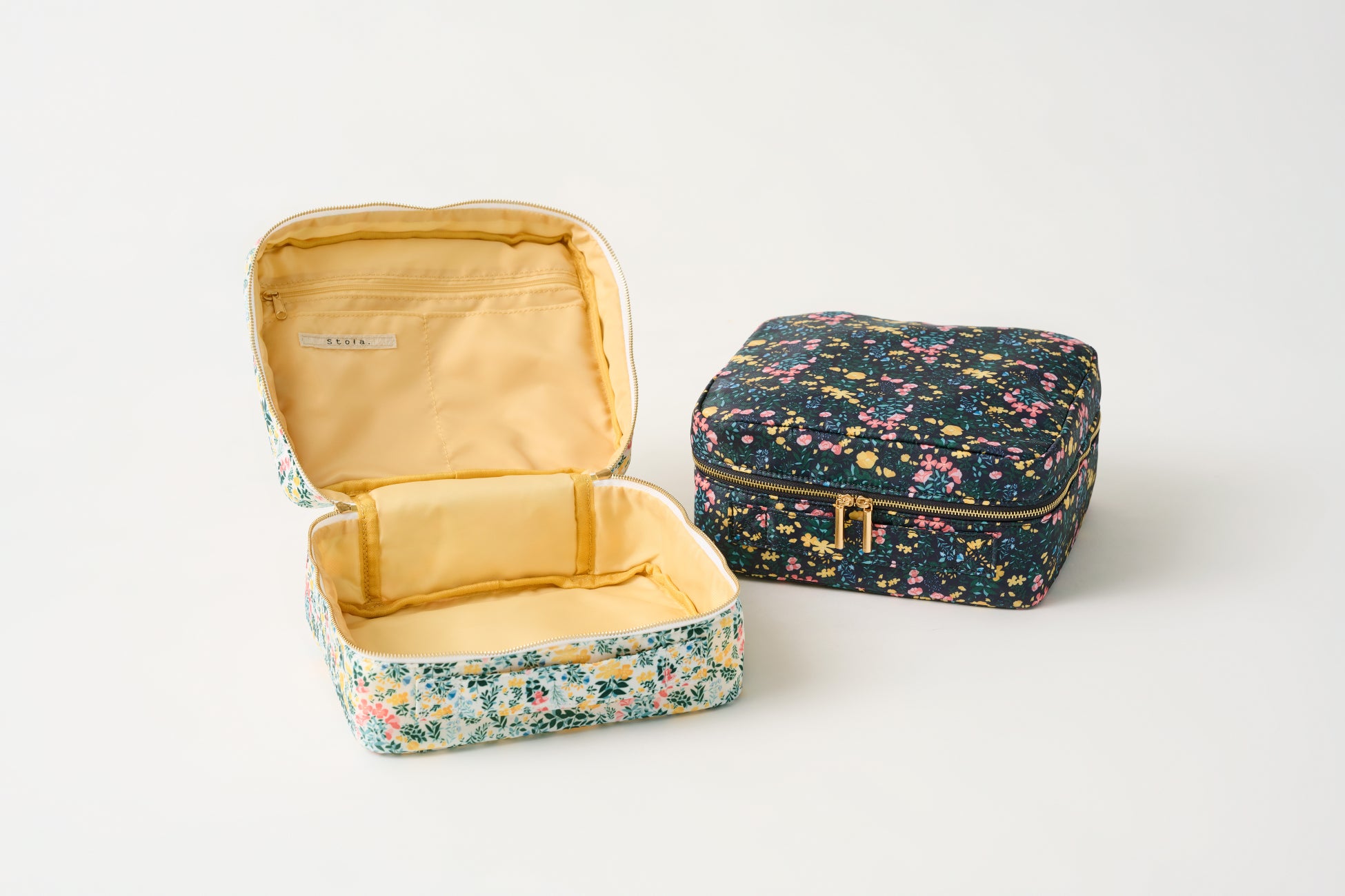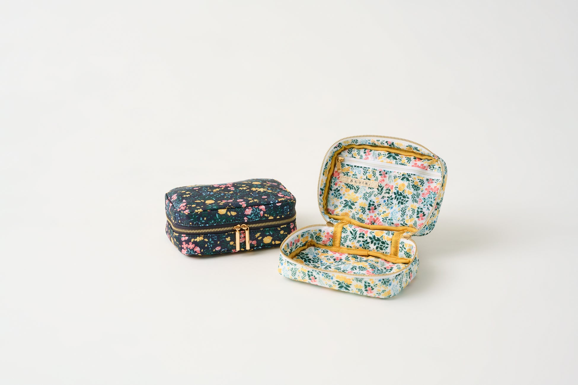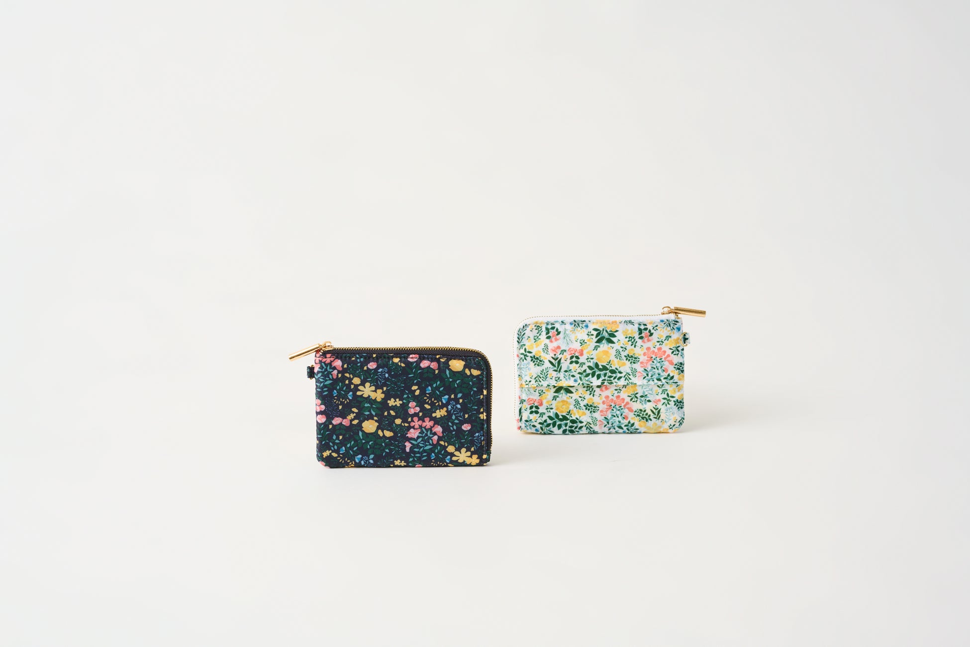スカーフと同じ柄をあしらった花柄ポーチ。パイピングは花柄の色にそれぞれ合わせ、デイリーなメイクポーチやトラベル用にも使える大中小の3サイズを用意。オフ系・ネイビー系の2色展開。