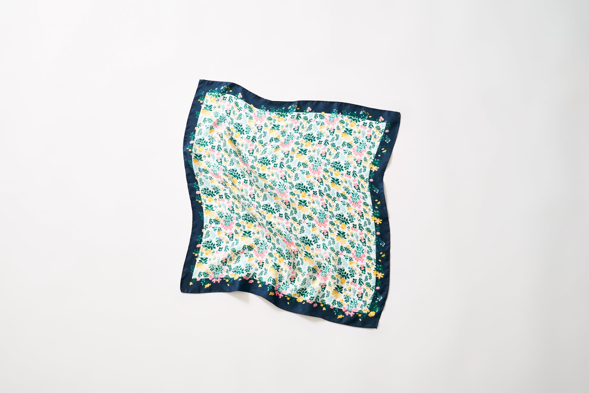 カラフルなフラワーとリーフをあしらった小花柄を、シルク100%のツイル素材にプリントしたスカーフ。小判サイズで首元やバッグに巻くのにちょうど良いサイズ。ネイビーの1色展開。