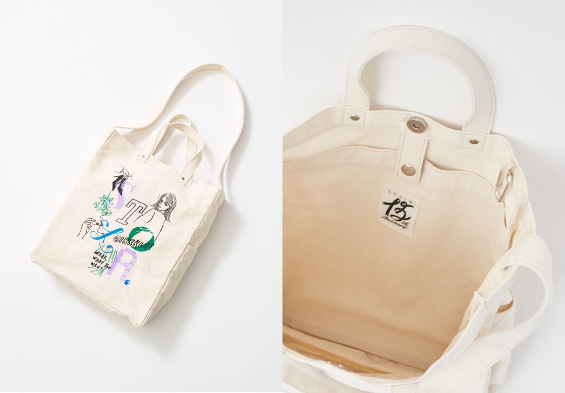 ファッション、メイク、アートを通じオシャレを楽しむ女性をイメージした図案をフロントにあしらったトートバッグ。キャンペーンロゴにも使用するリボンモチーフと星の数で15周年を表した。ショルダーとトートどちらでも使える2way仕様で、内側にはカラビナ付き。内外に複数ポケットをつけることで機能面にもこだわった。