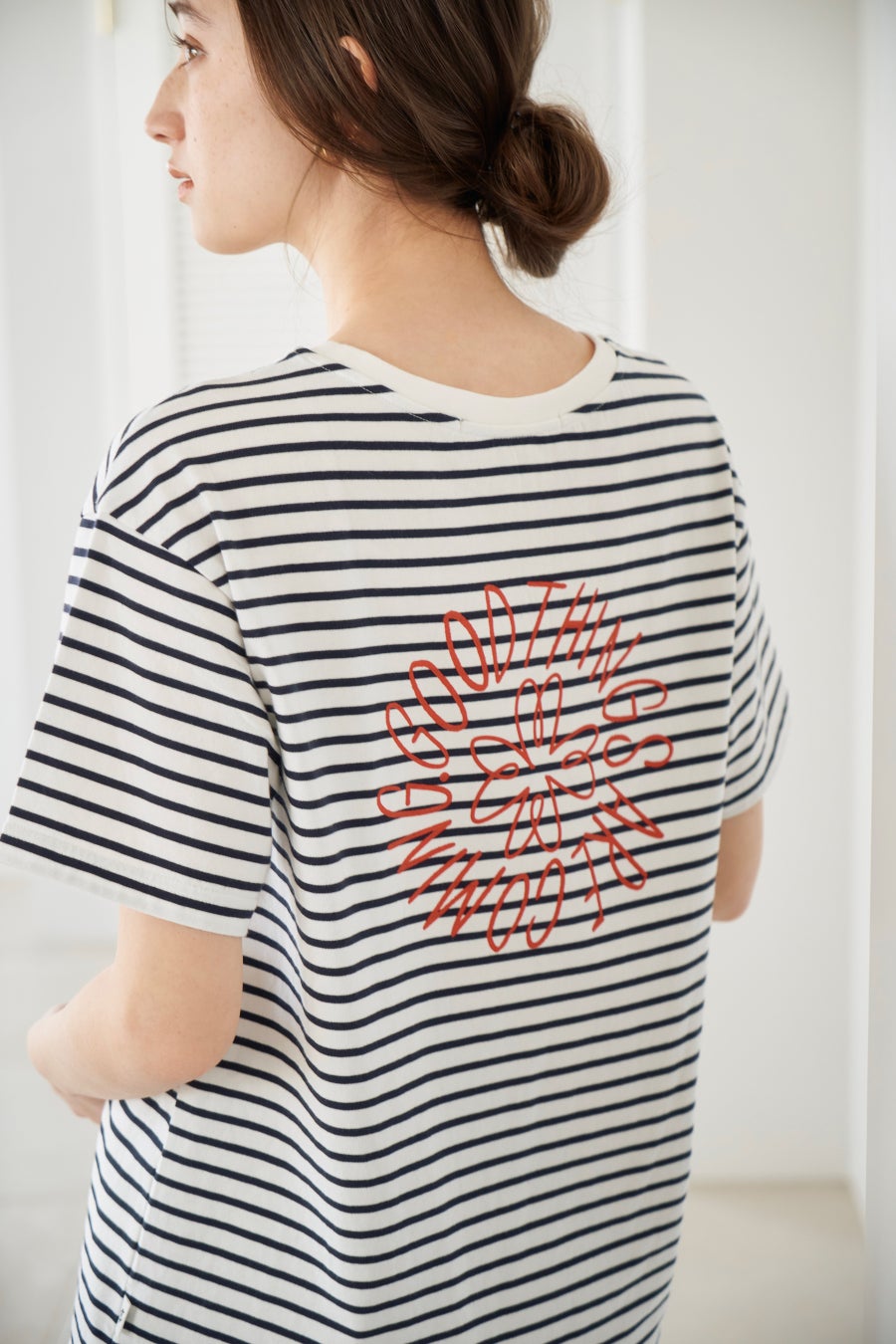 商品詳細:コットン100%、M/ユニセックスの2サイズ展開、価格:無地¥7,480、ボーダー¥8,580