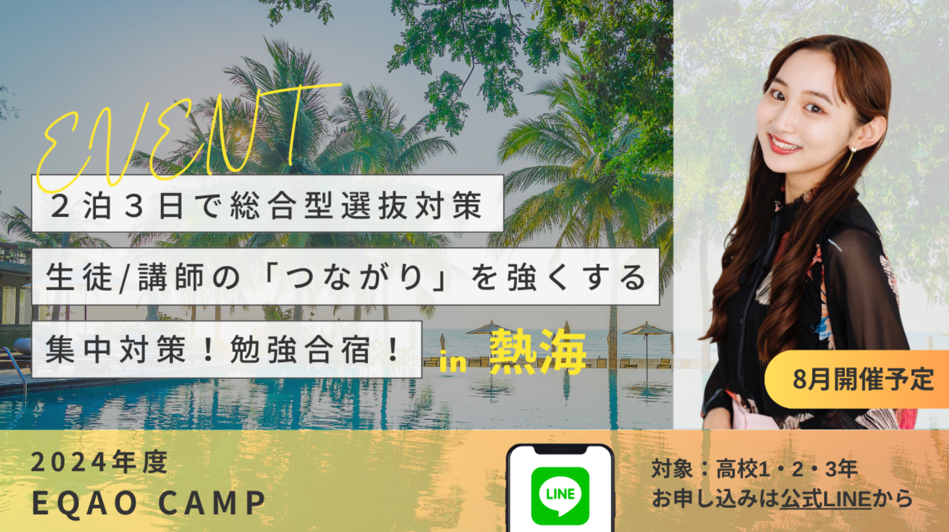 さらに、活動実績がまだない受験生に向けて、熱海市内でのフィールドワークを行い、活動実績づくりまで完全サポート!興味のある高校生の方はぜひお申し込みください!EQAOCAMPの定員は15名とさせていただきます。定員に達し次第、参加者申込の受付を終了させていただきます。
