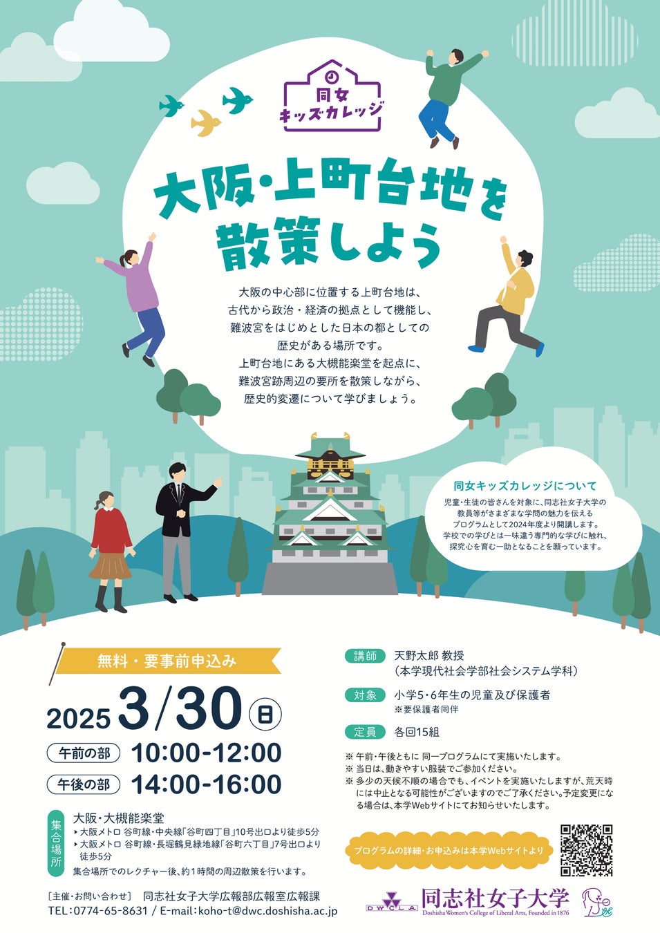 「同女キッズカレッジ」は、小・中学生の児童・生徒の皆さまを対象に、同志社女子大学の教員等がさまざまな学問の魅力を伝えるプログラムとして、今年度より開講しました。第2回は、大阪の中心部に位置する「上町台地」を散策するプログラムを実施します。大槻能楽堂を起点に、難波宮跡周辺の要所を散策しながら歴史的変遷について学び、大阪の魅力を再発見いただくことを目的としています。