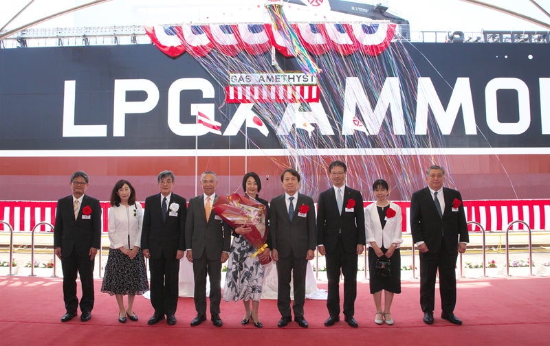 当社とアストモスエネルギー株式会社(以下「アストモスエネルギー」)が共同保有する大型LPG(Liquefied Petroleum Gas、液化石油ガス)運搬船の命名式が6月12日、 川崎重工業株式会社 坂出工場で行われ、「GAS AMETHYST(ガス アメジスト)」と命名されました。本船は3月に竣工したGAS GARNET(ガス ガーネット)に続くLPG二元燃料エンジン搭載船で、共同保有船としては今年2隻目、アストモスエネルギー向けLPG二元燃料船としては4隻目になります。
