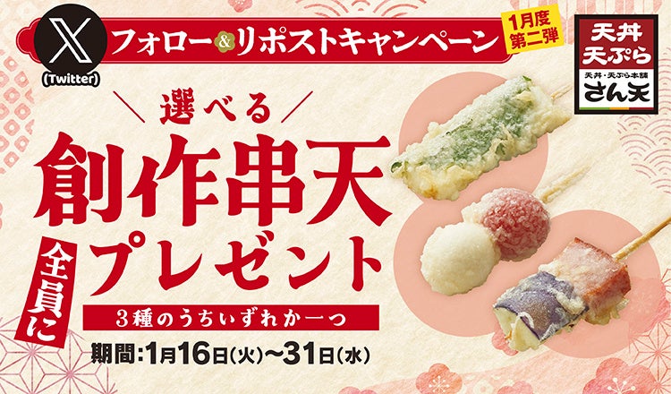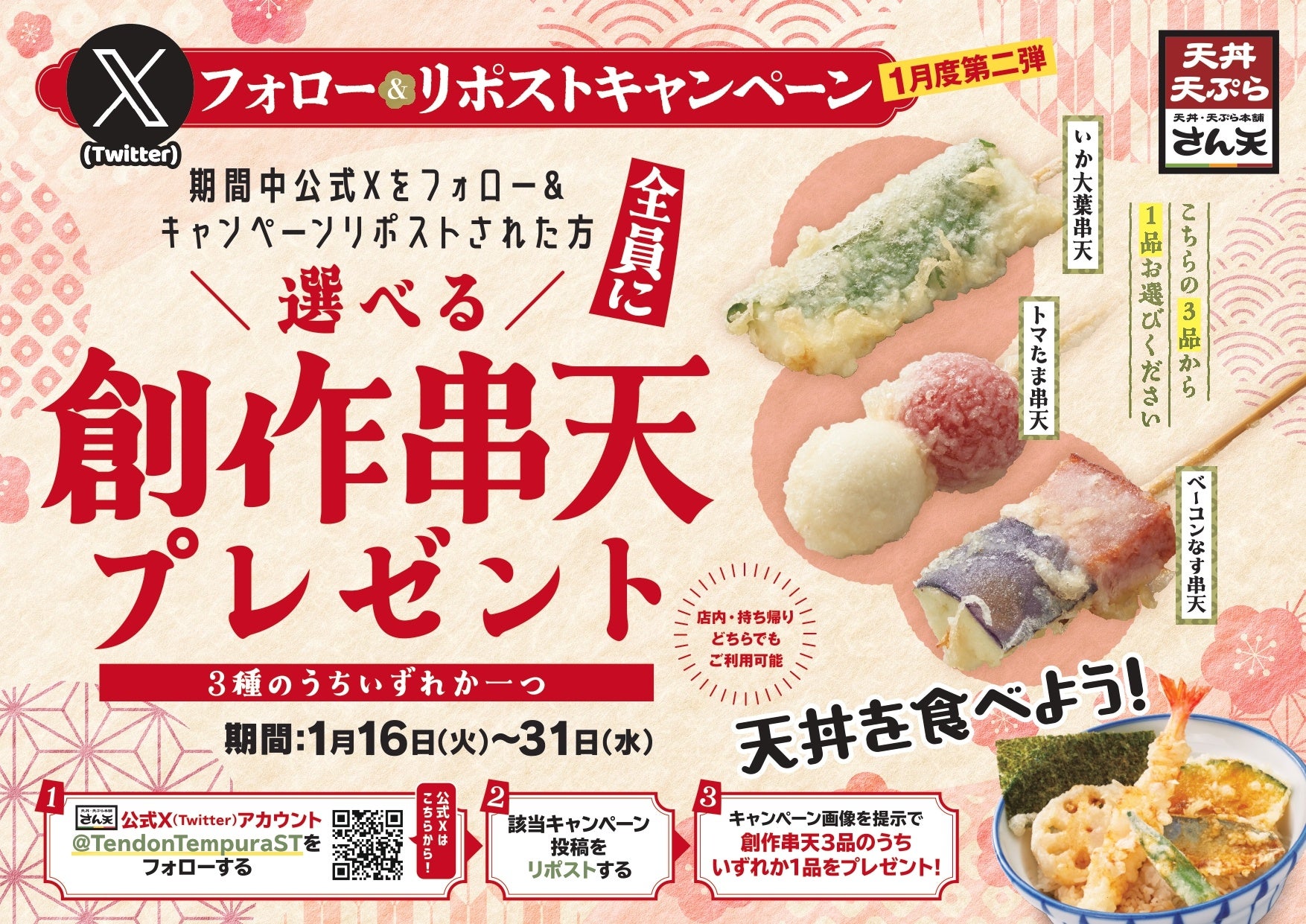 【天丼・天ぷら本舗 さん天】1/16~何度でも「創作串天」がもらえるXキャンペーン開催!