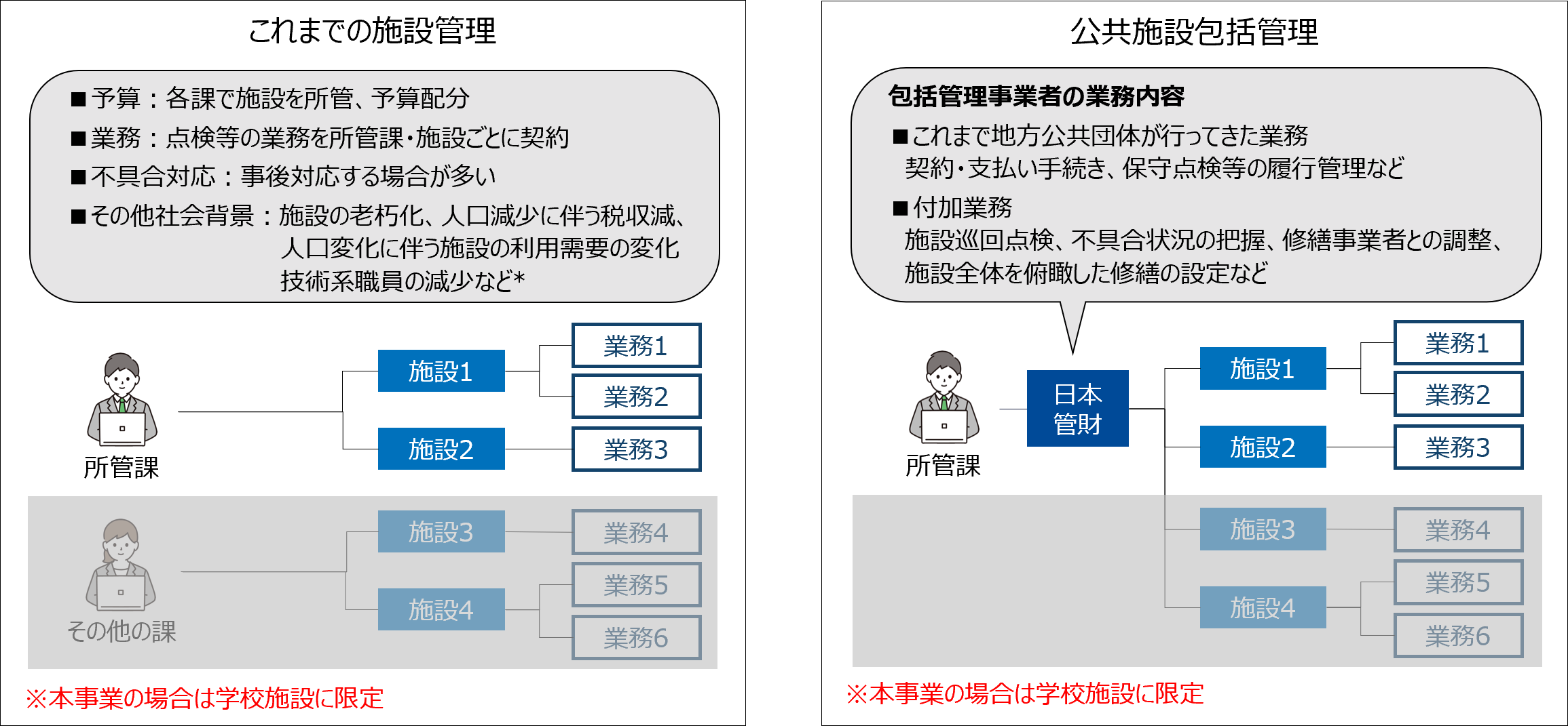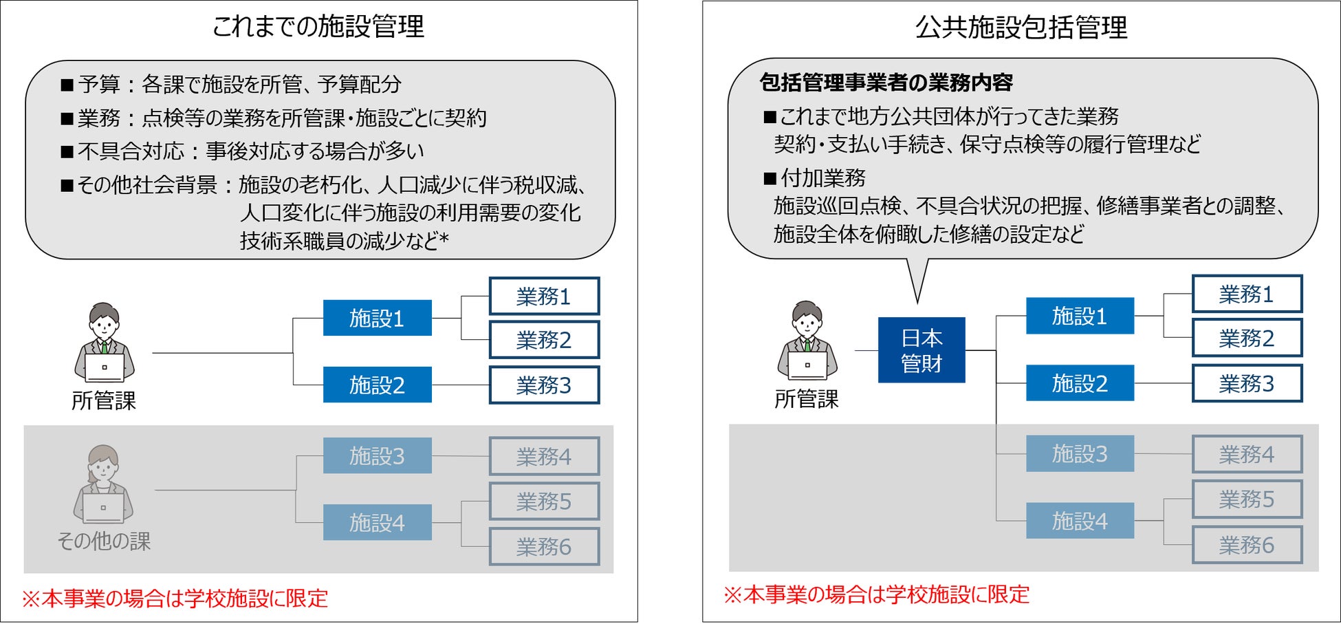 こうした行政課題に対応し、学校施設の維持管理水準を高め、教育環境を安定的に確保することを目的に、「公共施設包括管理」を導入することとなり、2025年12月から2026年3月にかけて公募型プロポーザルが実施されました。