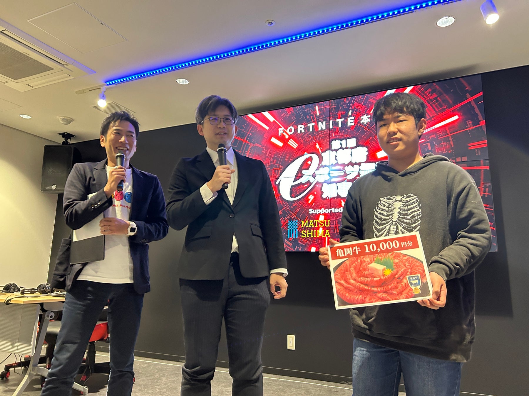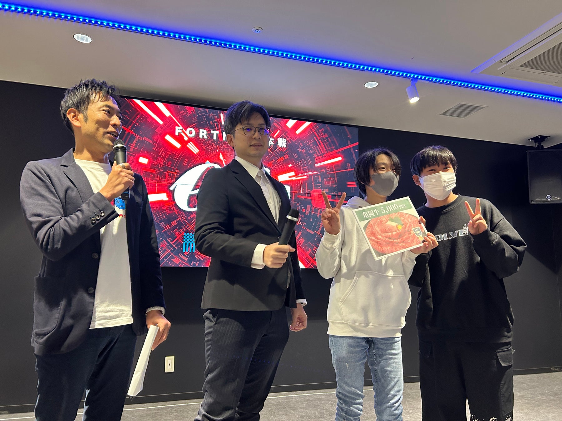 決勝はバトルロイヤルを5戦開催し、順位ポイントとエリミネートポイントの合計を競いました。 3位のチームには1,500 円分プリペイドカードが2枚と亀岡牛5,000円分、2位のチームには5,000 円分プ リペイドカードが2枚と亀岡牛1万円分、そして1位のチームには1万円分プリペイドカード×2枚と亀岡 牛2万円分が贈呈されました。