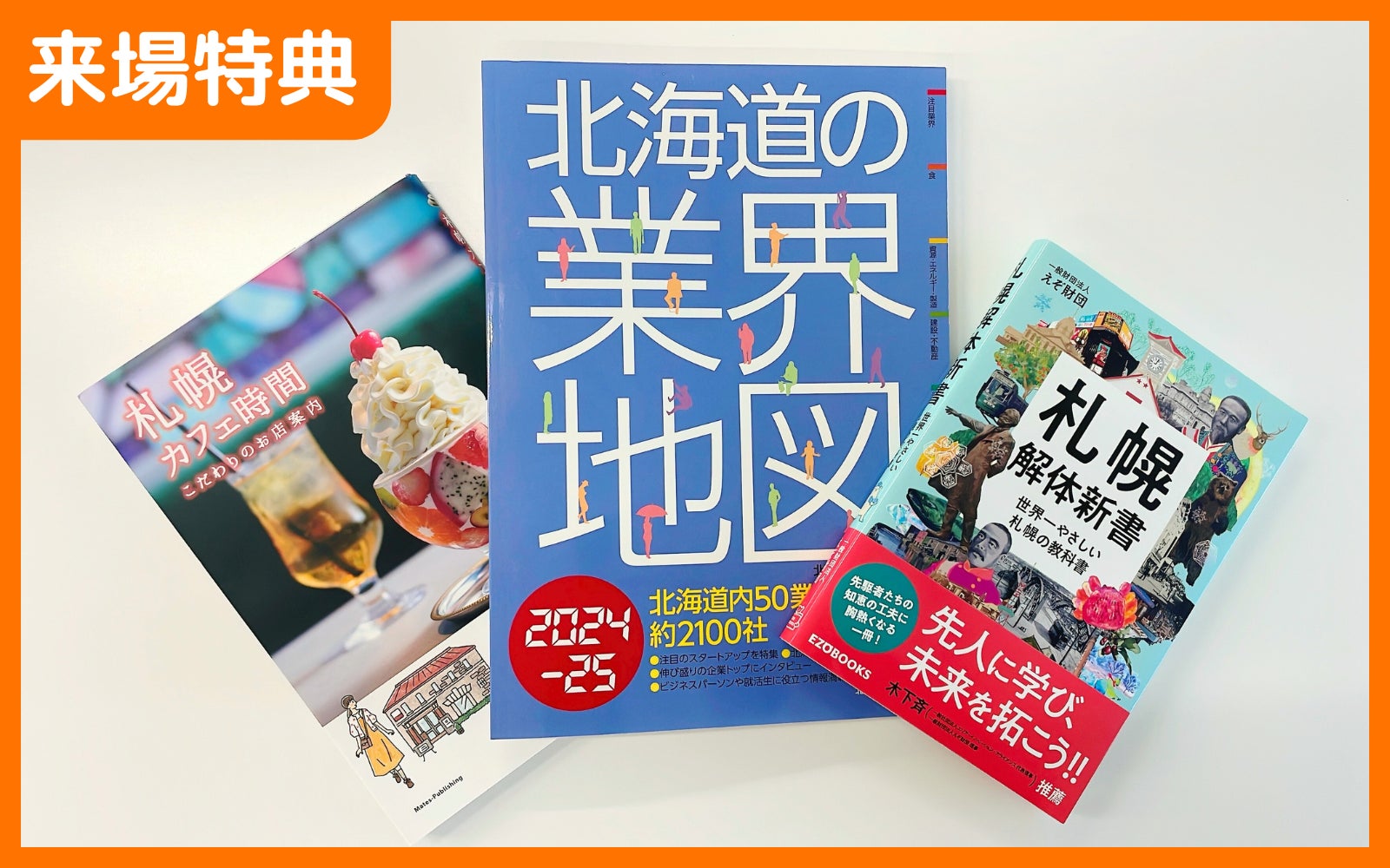 企業説明会①②③それぞれの時間帯に参加&計6社以上ご訪問いただいた方に、「北海道の業界地図」「札幌解体新書」「札幌カフェ時間」からお好きな1冊をプレゼント!