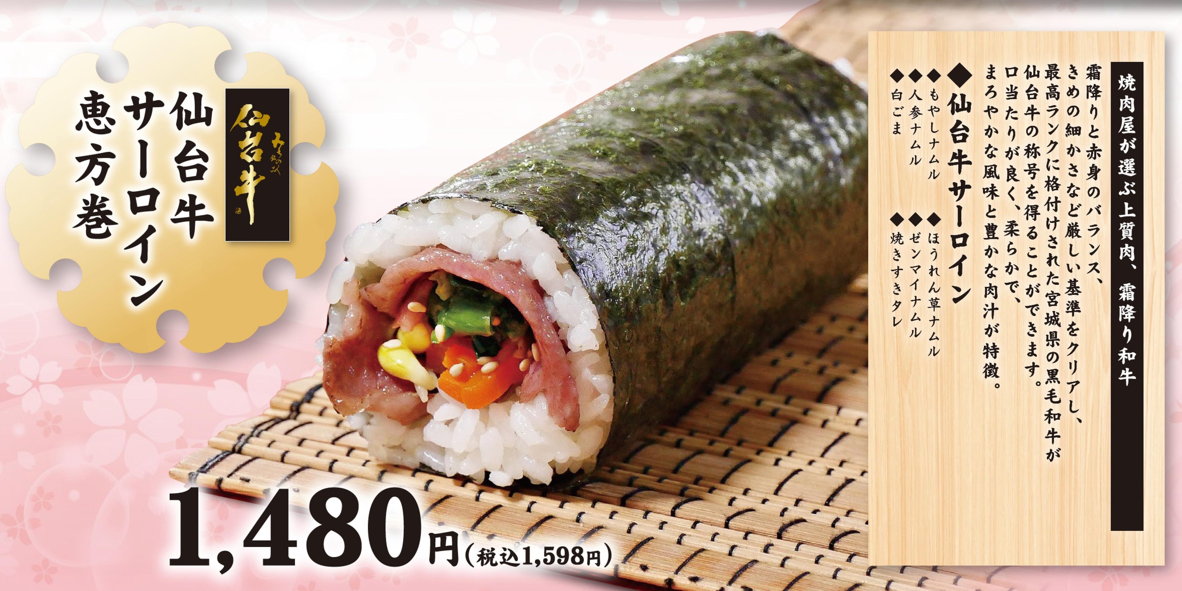 焼肉専門店ならではの、ジューシーな「鶏もも恵方巻」やわらかい「豚カルビ恵方巻」栄養バランスのとれた店内仕込みのナムルが入った「キンパ恵方巻」の3種類に加え、ワンランク上の「仙台牛サーロイン恵方巻」もご用意しております。こちらは、霜降りと赤身のバランス、きめの細かさなど厳しい基準をクリアした最高ランクの宮城県産黒毛和牛・仙台牛を使用しております。口当たりが良く、柔らかで、まろやかな風味と豊かな肉汁が特徴です。(食べやすいハーフサイズ長さ約9cm)