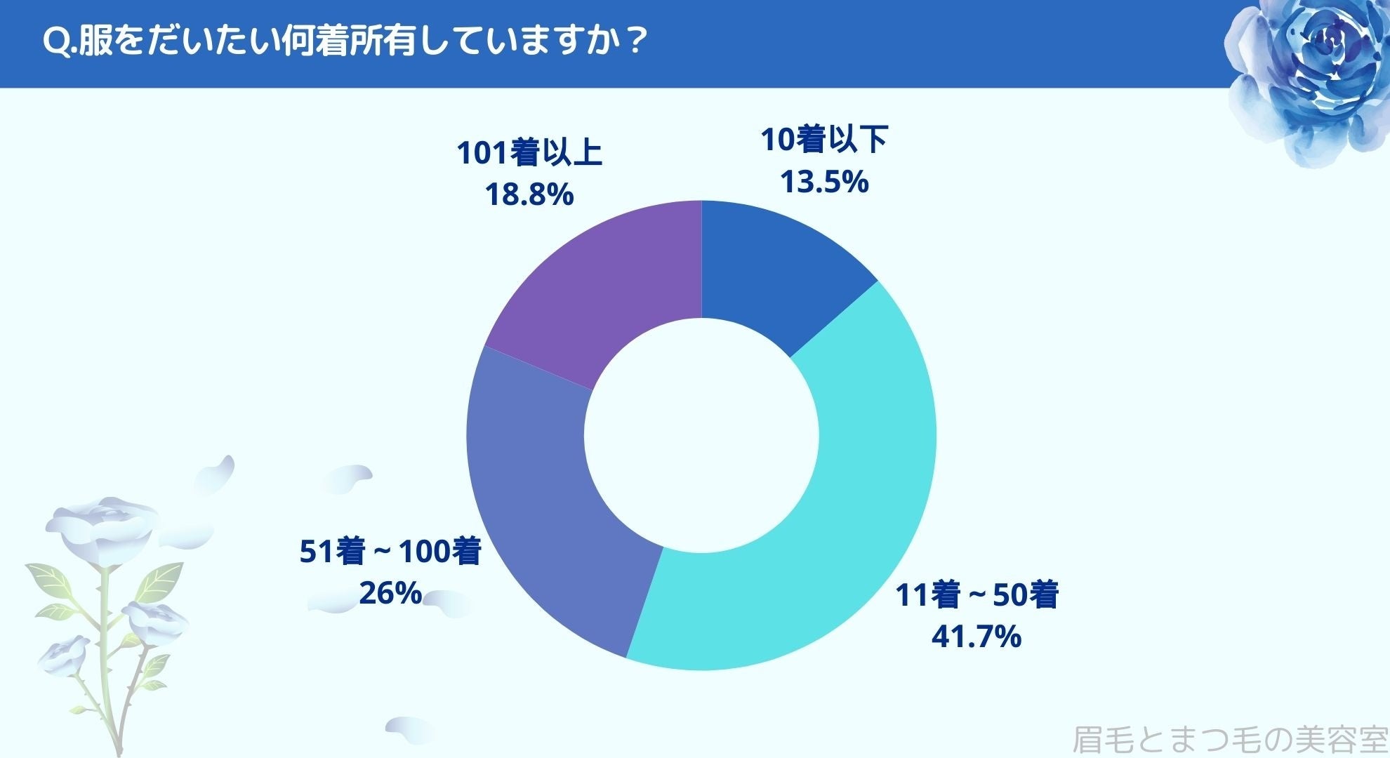 服の所持数をお聞きしたところ「10着以下(13.5%)」、「11着~50着(41.7%)」、「51着~100着(26%)」、「101着以上(18.8%)」という結果になりました。