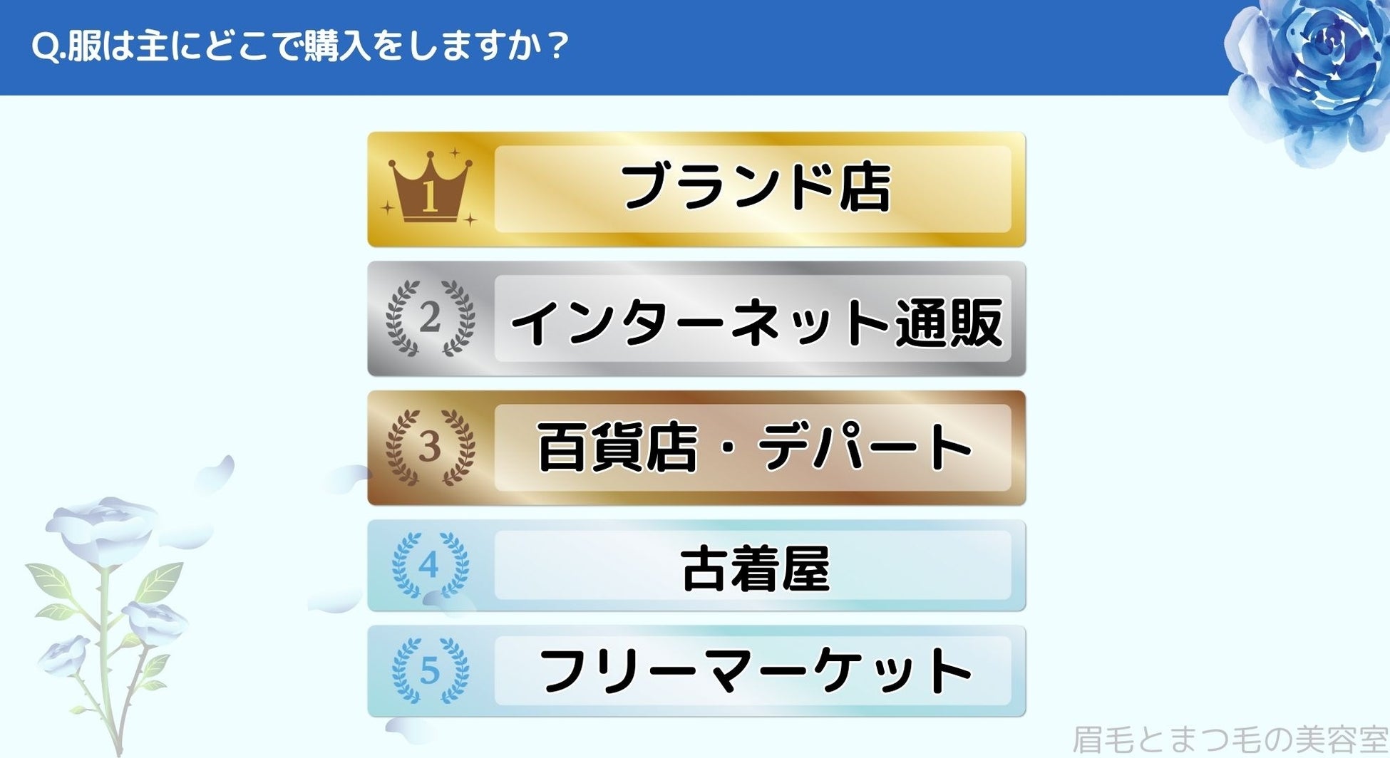 服を購入しているところをお聞きしたところ「1位>ブランド店」、「2位>インターネット通販」、「3位>百貨店・デパート」、「4位>古着屋」、「5位>フリーマーケット」という結果になりました。