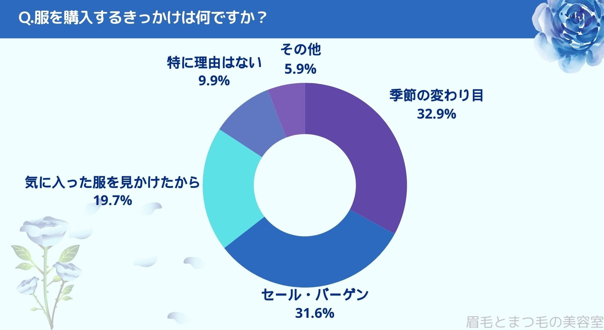 服を購入するきっかけをお聞きしたところ「季節の変わり目(32.9%)」、「セール・バーゲン(31.6%)」、「気に入った服を見かけたから(19.7%)」、「特に理由はない(9.9%)」、「その他(5.9%)」という結果になりました。