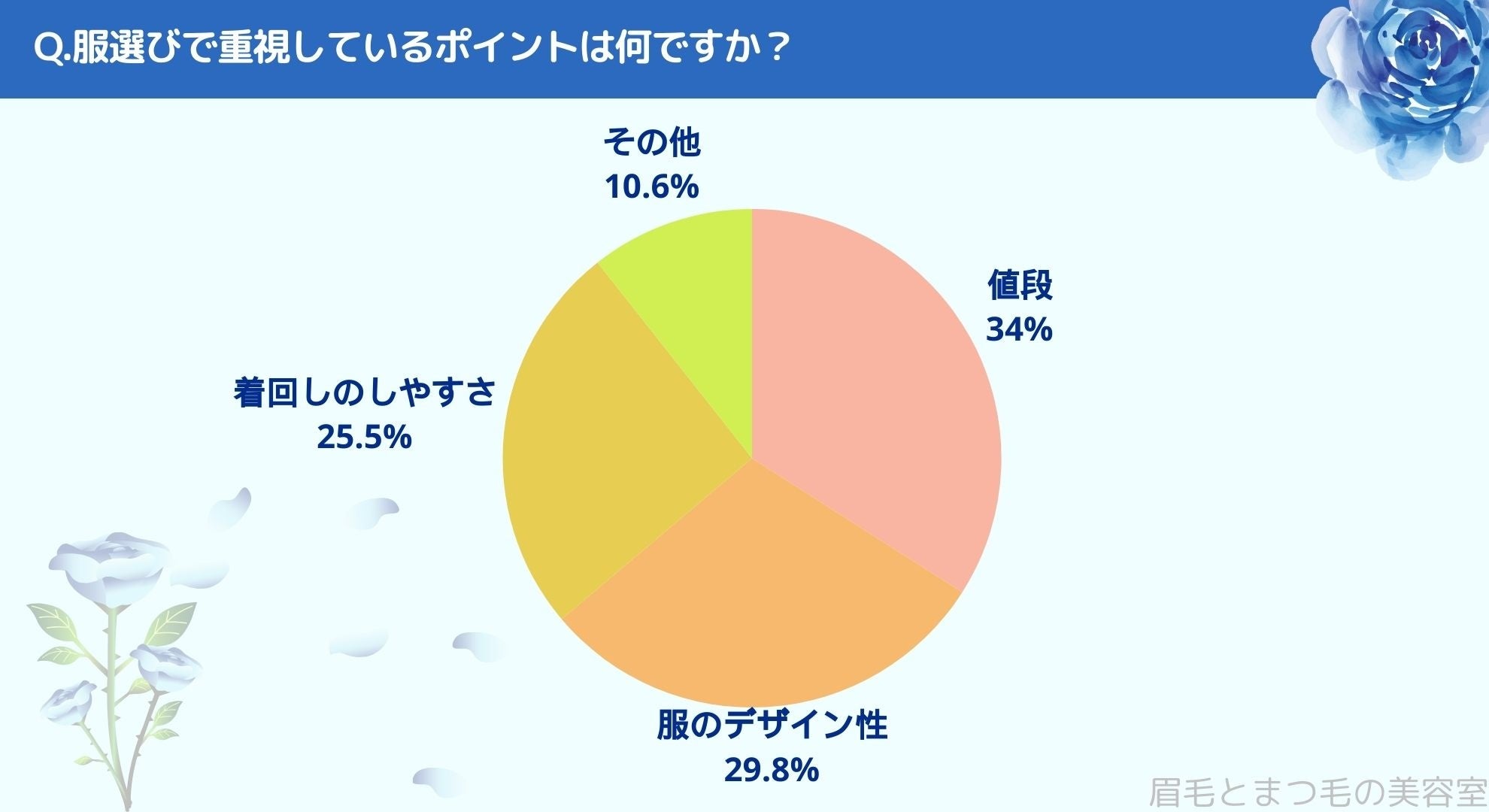 服選びで重視しているポイントをお聞きしたところ「値段(34%)」、「服のデザイン性(29.8%)」、「着回しのしやすさ(25.5%)」、「その他(10.6%)」という結果になりました。