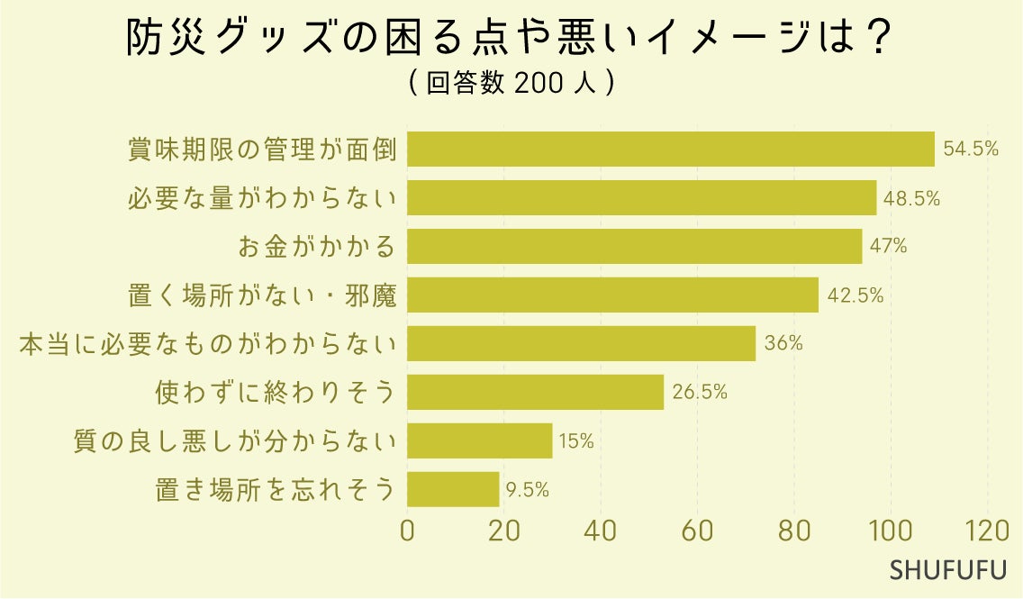 防災グッズの困る点や悪いイメージでは「賞味期限の管理が面倒」が最も多い回答でした。水や食料はどうしても時間が経つと食べられなくなるので定期的にチェックし入れ替える必要がある事は面倒に感じてしまうようです。