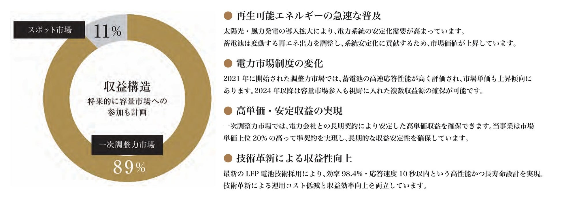 本ファンドの収益は、一次調整力市場での高単価契約を主軸 (約89%)とし、スポット市場取引(約11%)で補完する安定的な二本立て構造です。さらに将来的には容量市場への参入も計画しており、多様な収益源を確保していきます。 電力系統の脱炭素化が進む現在、系統用蓄電池の市場需要は今後10年で10倍以上に拡大すると予測されており、 先行者利益を確保できる有望な投資機会となっています。