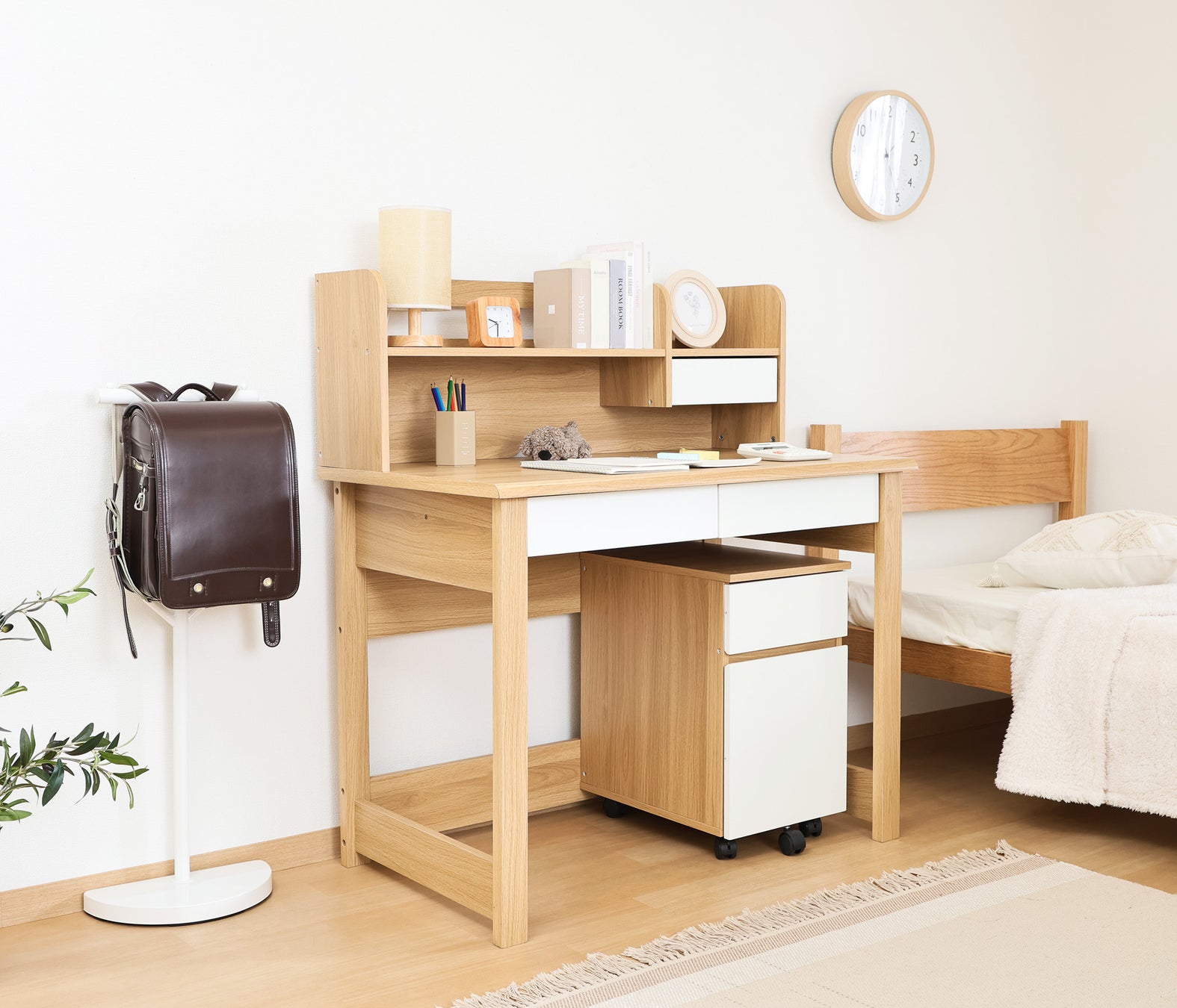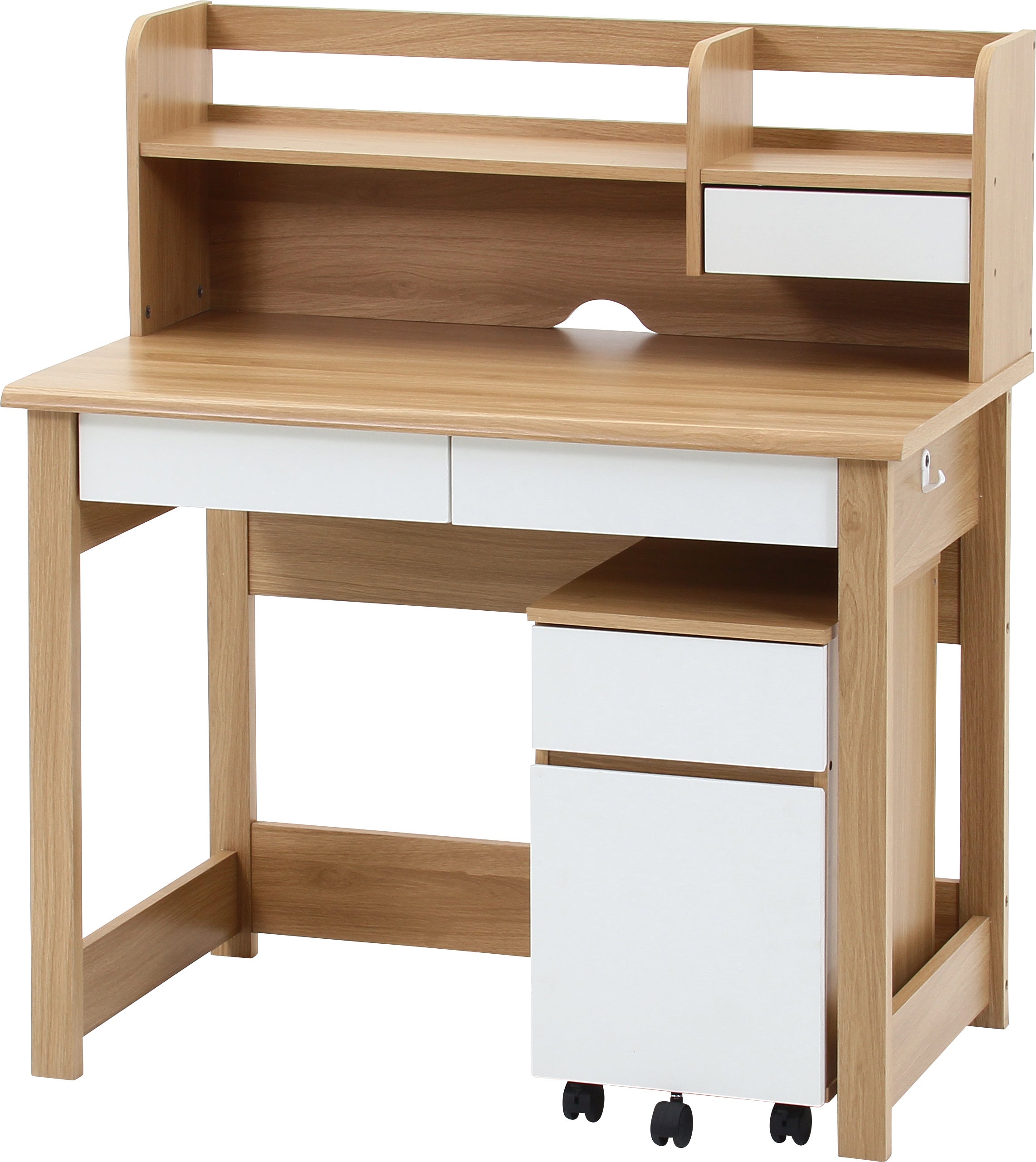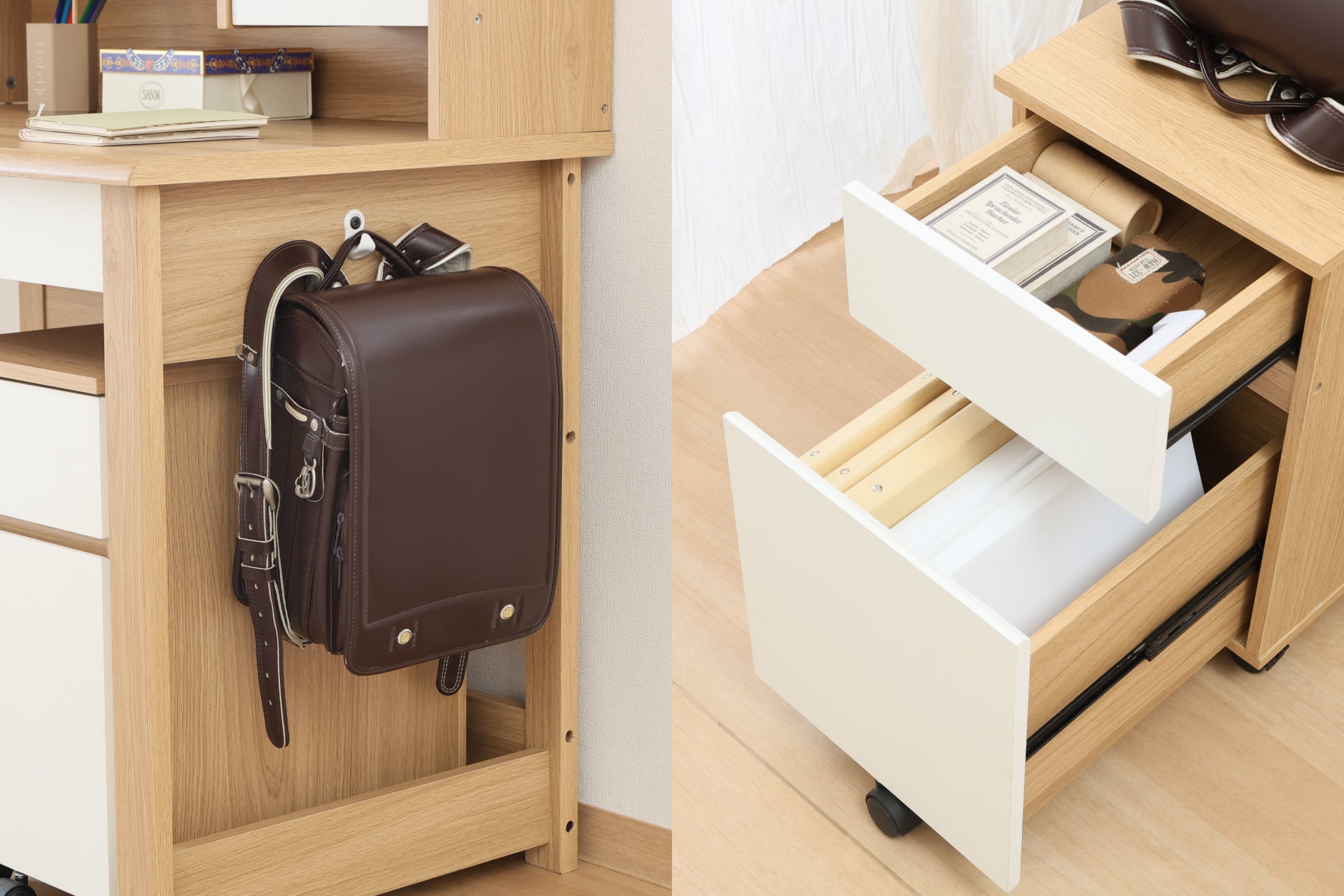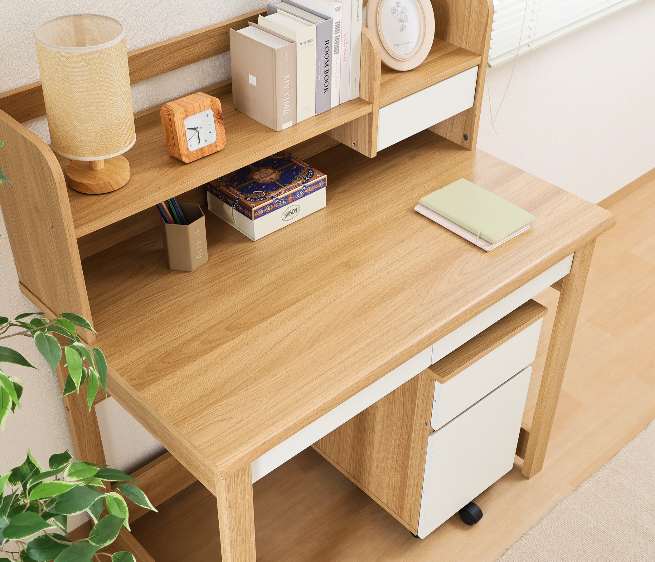 本商品は、ナチュラル色の木目をベースにホワイトを組み合わせた北欧テイストのやさしいデザインが特徴。幅98×奥行59cmとコンパクト設計ながら、引き出しや本棚、ワゴンなどの豊富な収納も備えています。小学校入学から大人まで長く使えるデザインで、リビングにもなじむインテリア性と、学習習慣を支える機能性を両立しました。