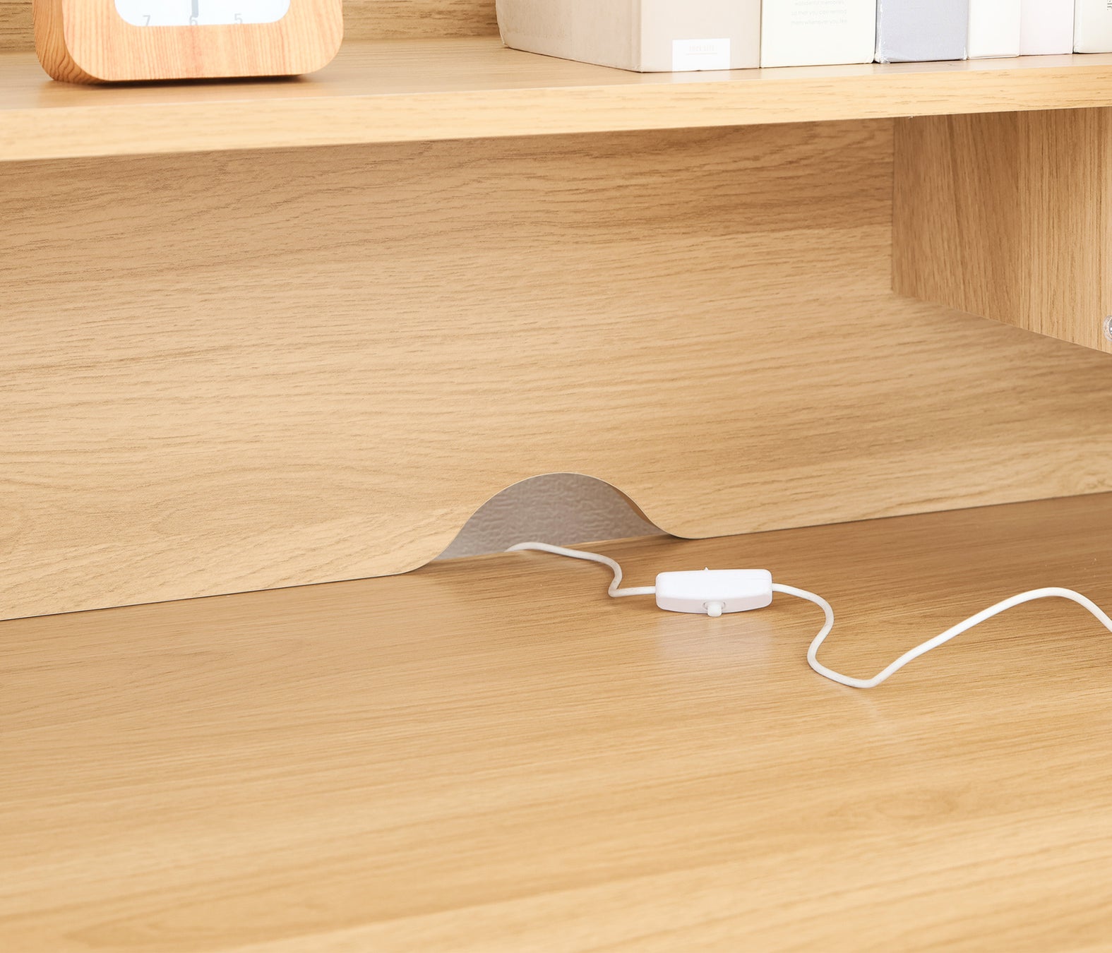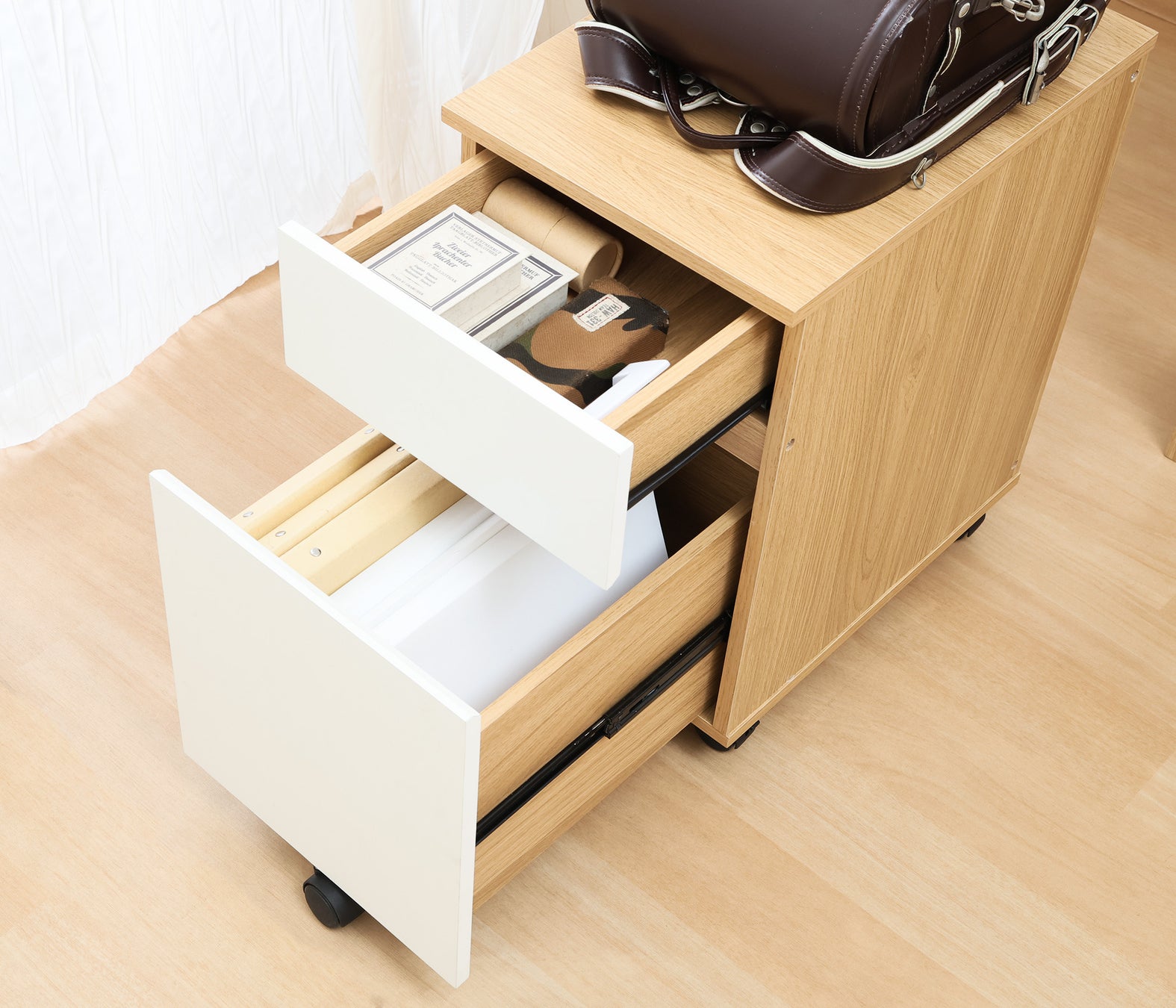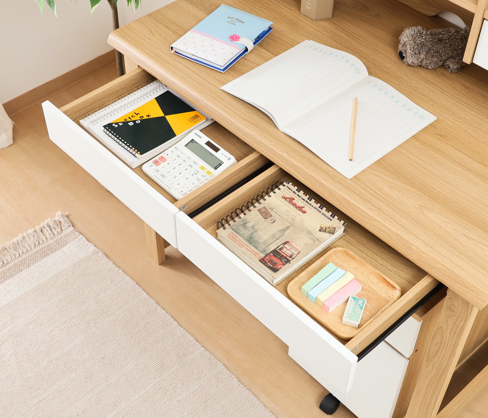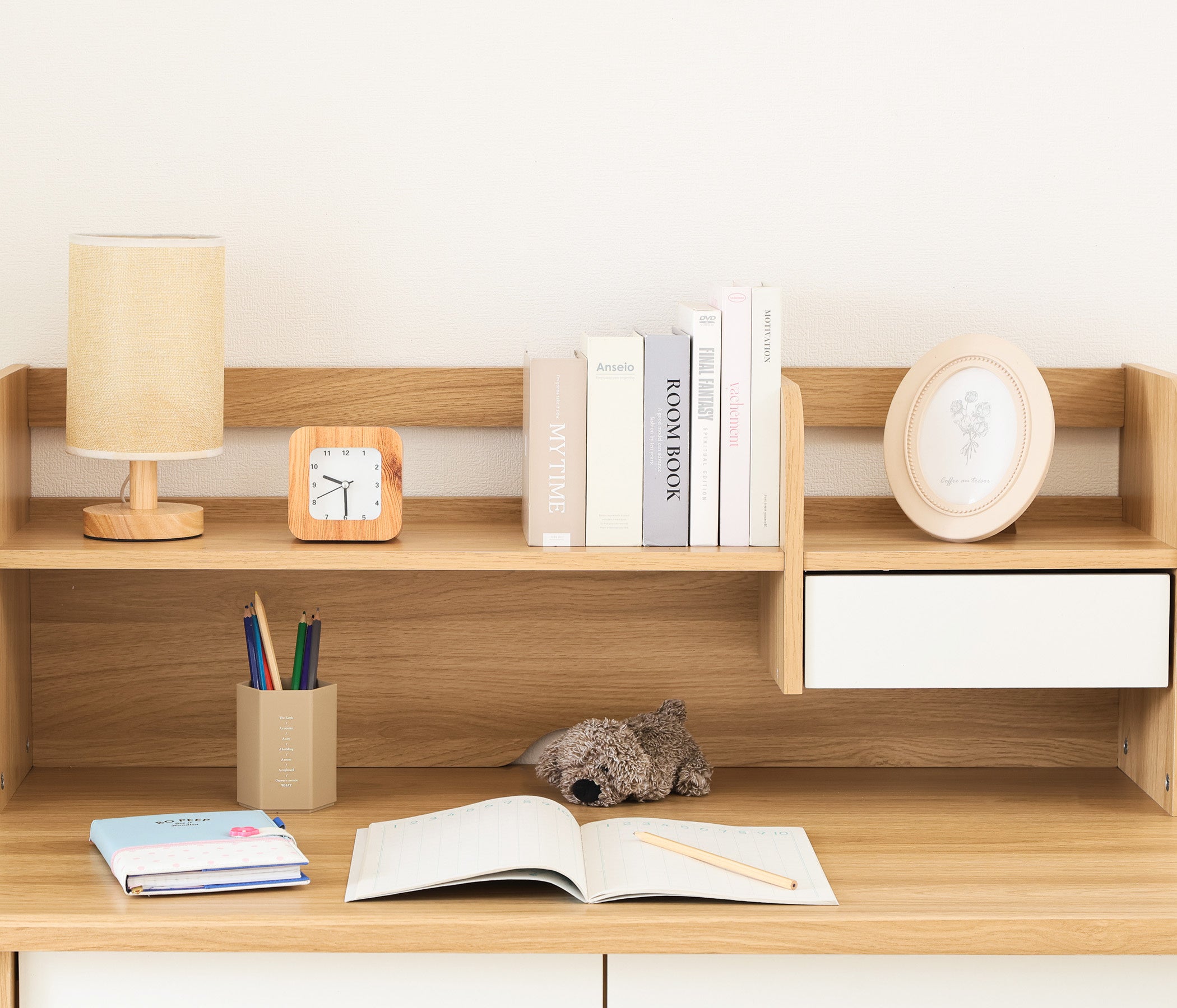 本商品は、ナチュラル色の木目をベースにホワイトを組み合わせた北欧テイストのやさしいデザインが特徴。幅98×奥行59cmとコンパクト設計ながら、引き出しや本棚、ワゴンなどの豊富な収納も備えています。小学校入学から大人まで長く使えるデザインで、リビングにもなじむインテリア性と、学習習慣を支える機能性を両立しました。