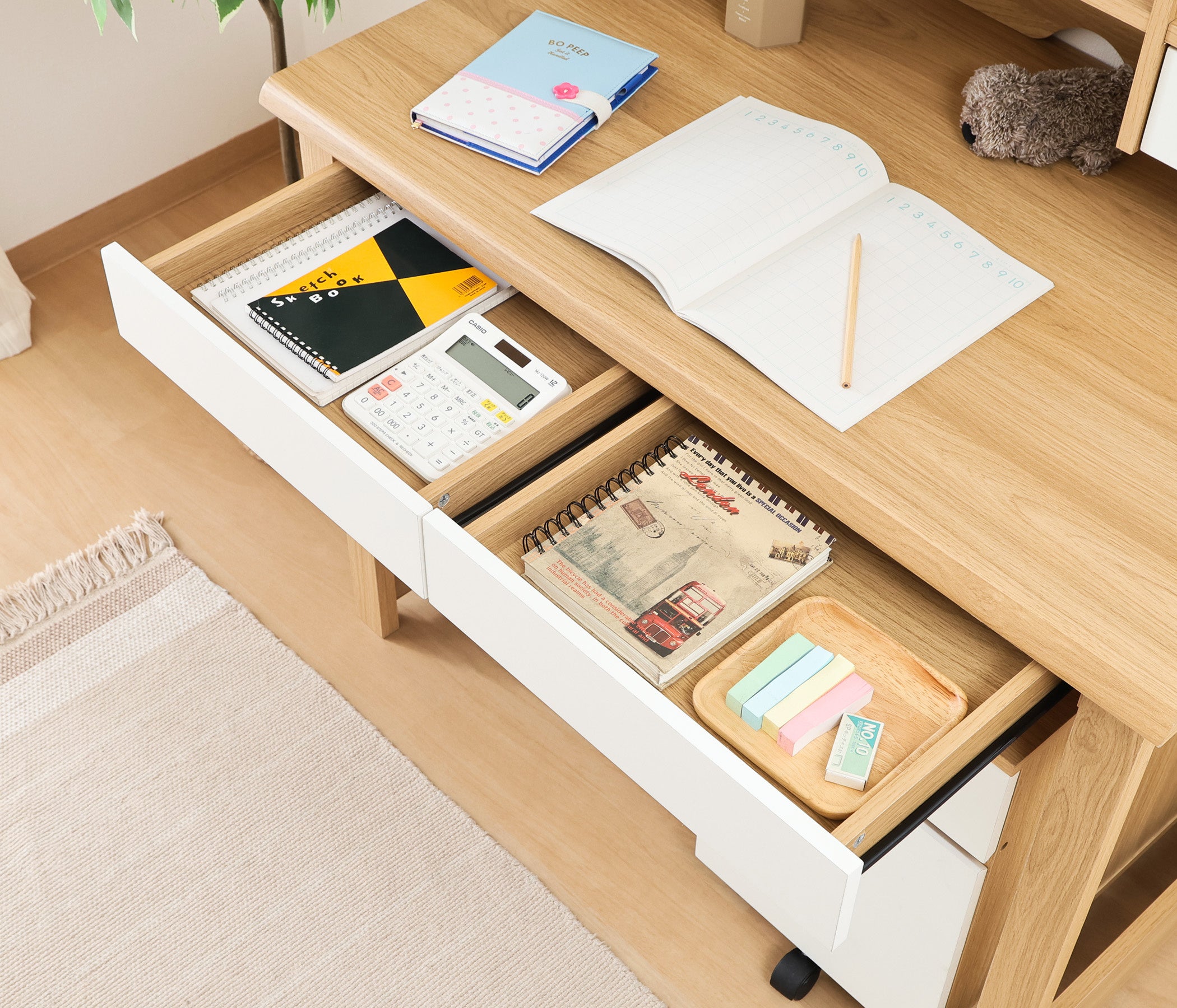 かつては存在感のある大型タイプが主流だった学習机も、現在はリビング学習を前提に「コンパクト化」が進んでいます。圧迫感を抑えたサイズ設計や、インテリアに溶け込むナチュラルなデザインが支持される一方、教材やデジタル機器が増える今の学習環境では、収納力との両立が新たな選択基準となっています。