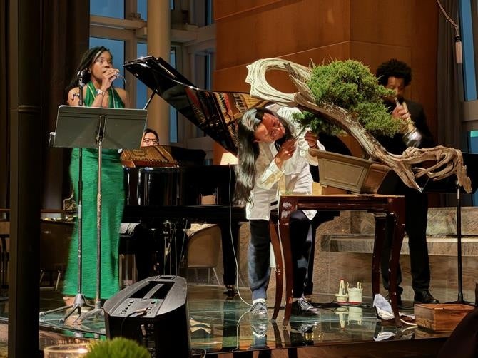 ホテル45階の「ザ・ロビーラウンジ」にて、盆栽の剪定や針金掛けなどの実技を、生演奏に合わせながら披露するデモンストレーションを実施します。